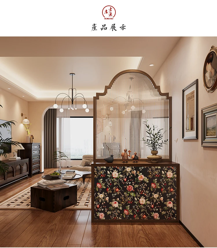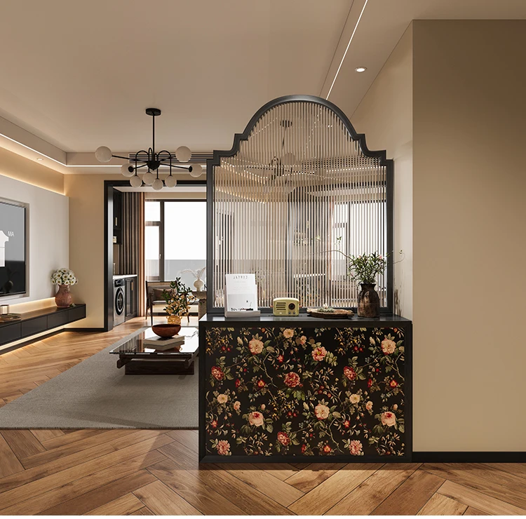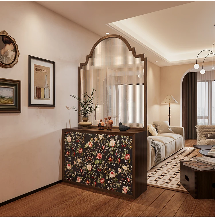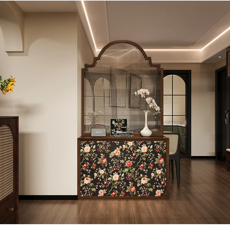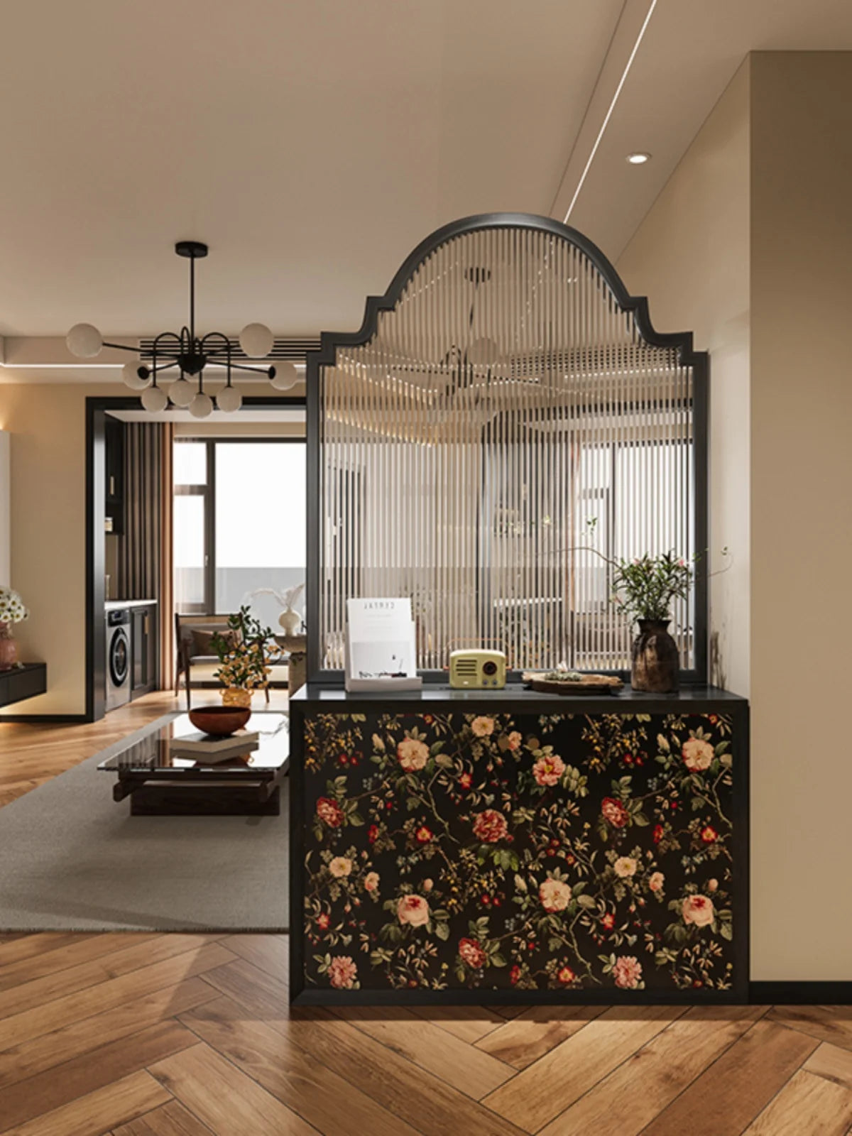 French retro wooden shoe cabinet, Changhong glass screen partition, living room entrance door obstructing bathroom, dining room
