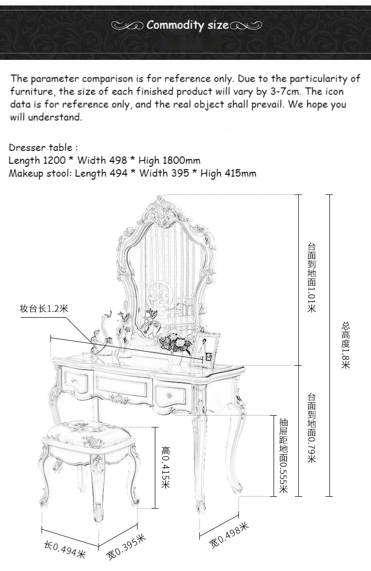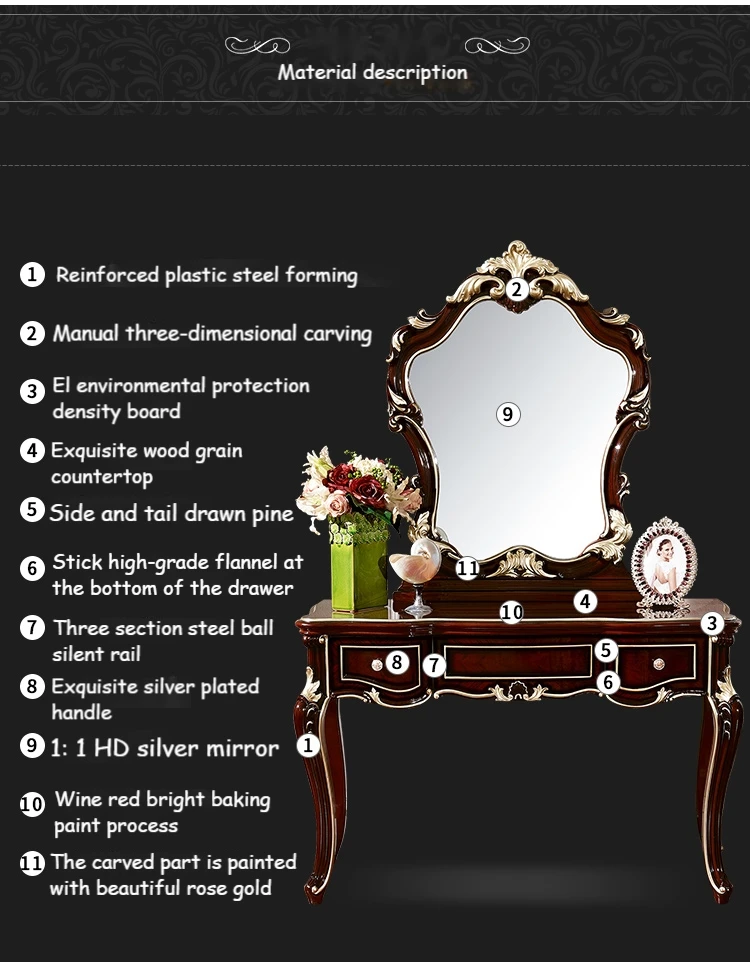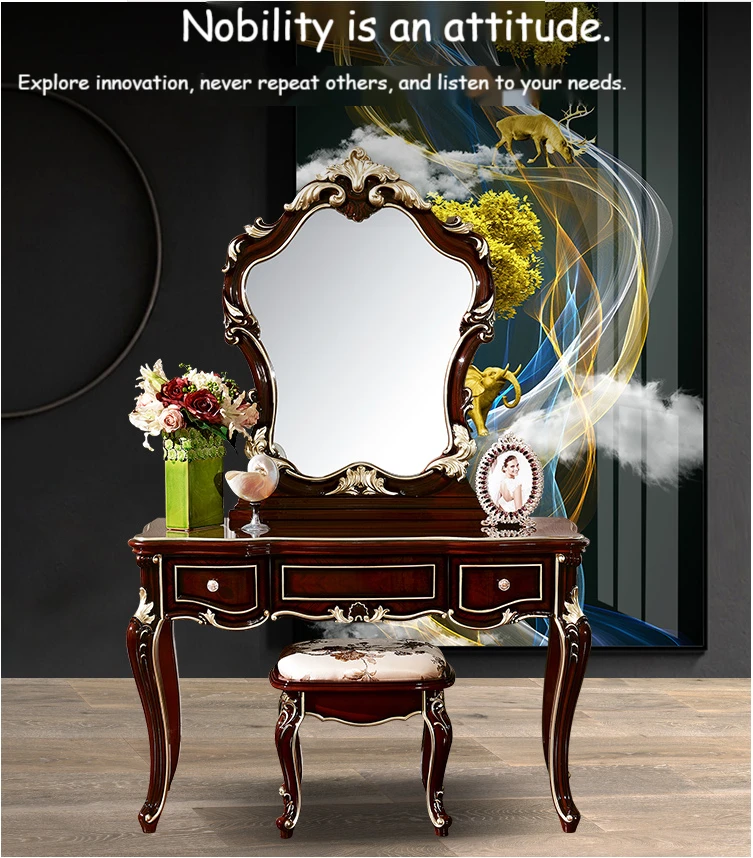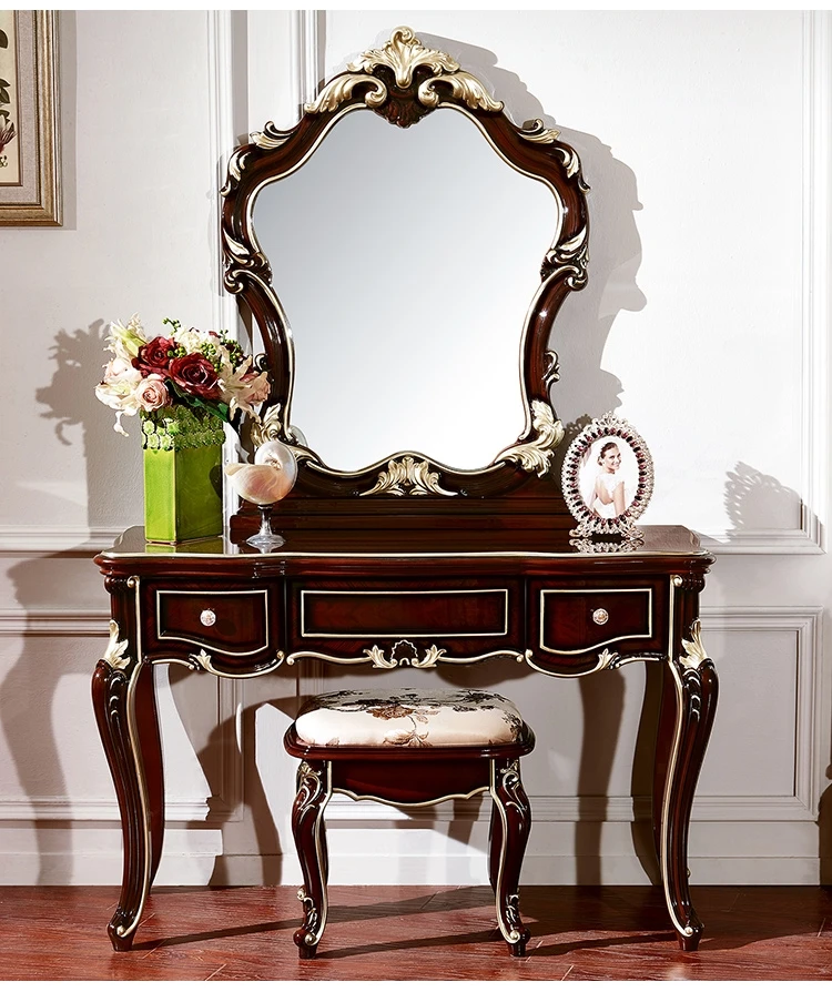 French solid wood dressing table European Princess dresser table bedroom luxury desk dressing table integrated women's wine red
