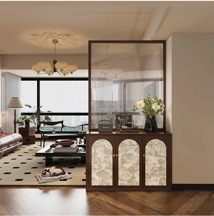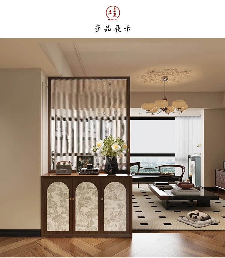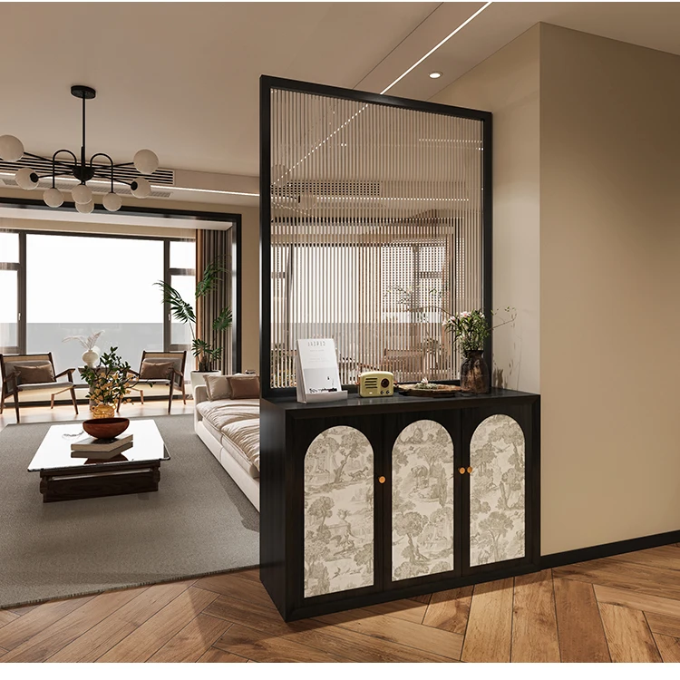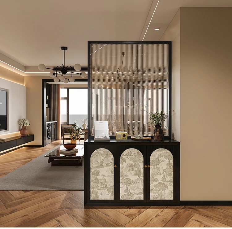 French solid wood shoe cabinet with glass screen partition, living room entrance door, dining room, bedroom obstructed, househol