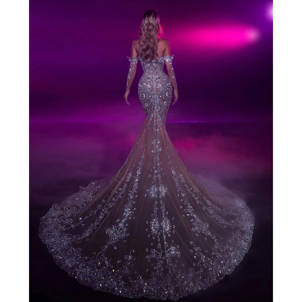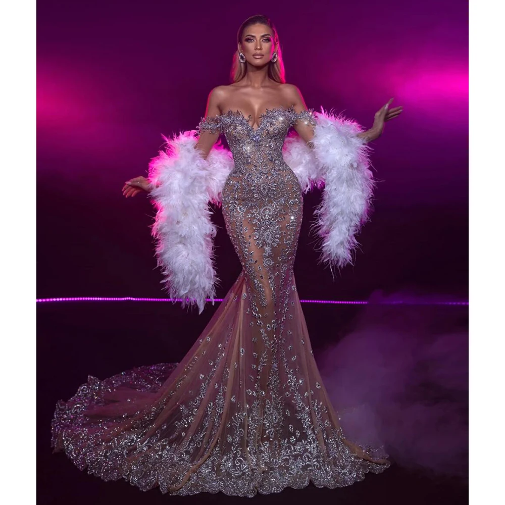 Graceful Off The Shoulder Evening Dress Sparkly Crystal Beads Prom Gown Luxury Feathers Mermaid Cocktail Dresses Robe De Mariée