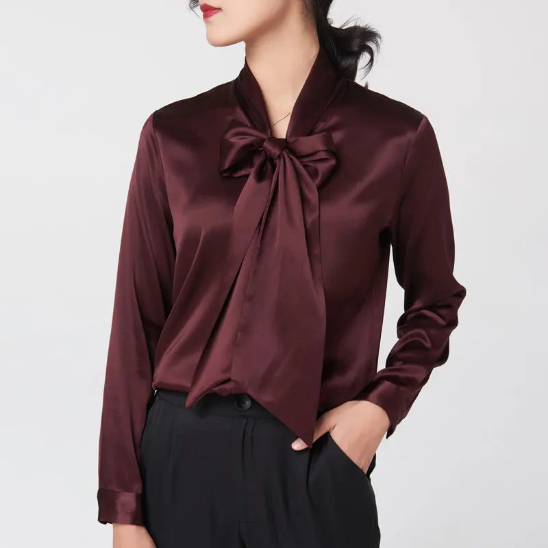 Heavyweight Mulberry Silk Shirt Women's 2023 Spring and Autumn New Long Sleeve Satin Silk Blouse V-neck Bow Ribbon Shirt