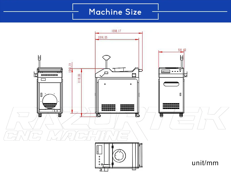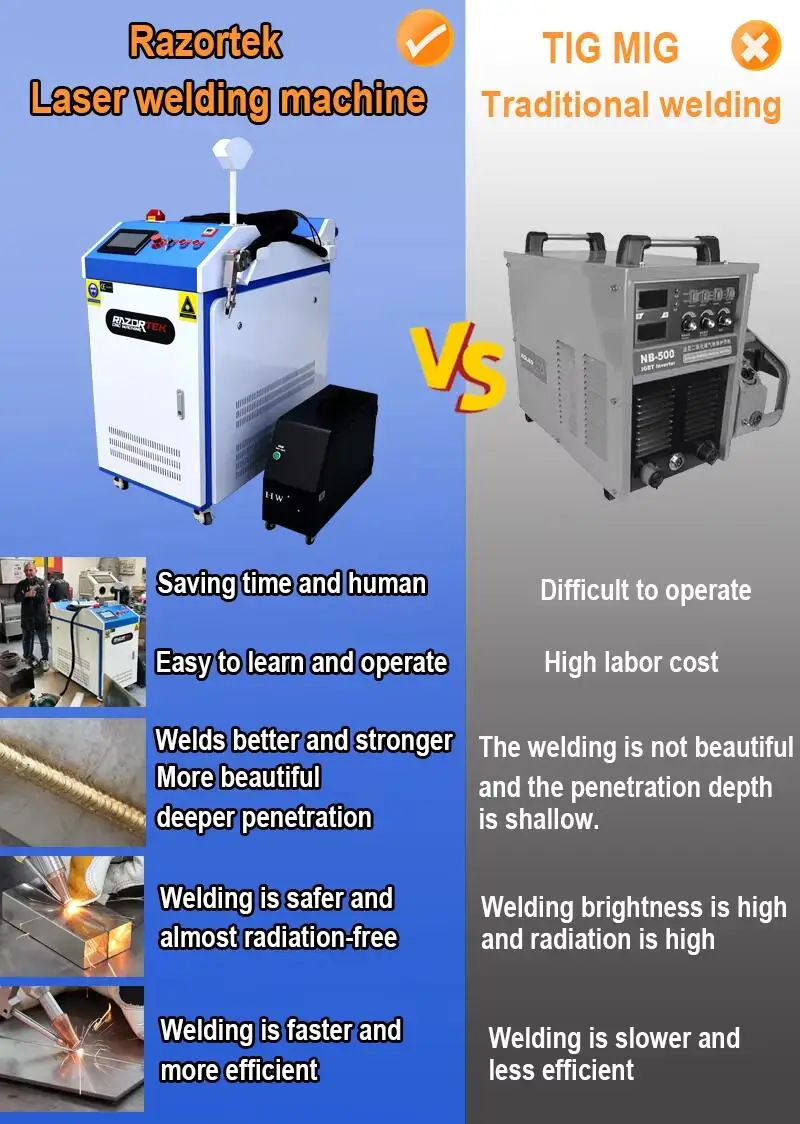 Razortek laser welding machine Application in Stainless steel, Carbon steel, Aluminum, Copper materials, etc. Beautiful weld, fast speed, no consumables, no welding mark, no discoloration, no need to polish later. Can be configured with a variety of Angle nozzle to meet the welding needs of different products.