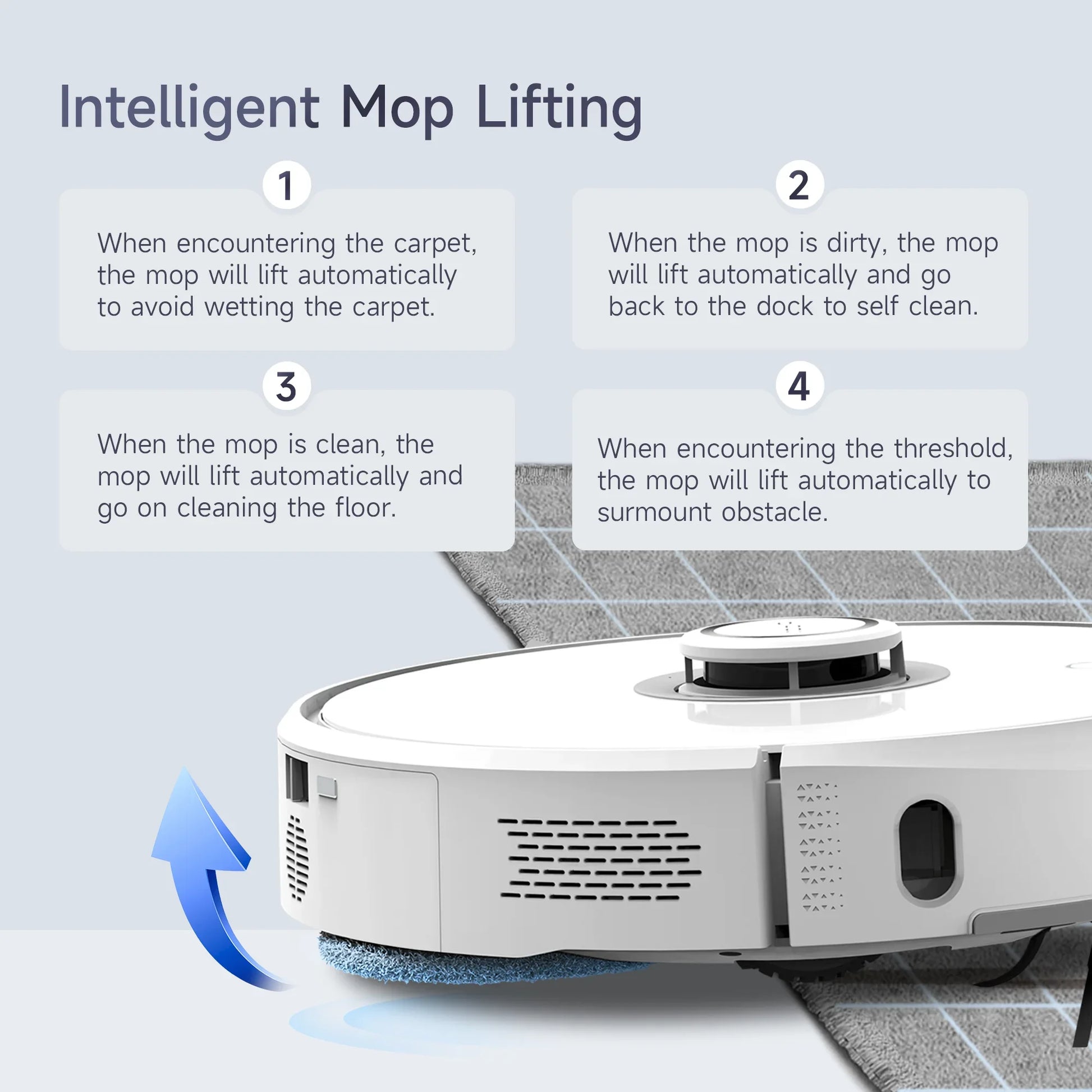 Automatic Water Supply and Drain, Carpet Identification Booster, Mop Self-cleaning, Mop Heat Drying, Robot Automatic Water Refilling, Dock Self-cleaning, Quick Mapping, etc.