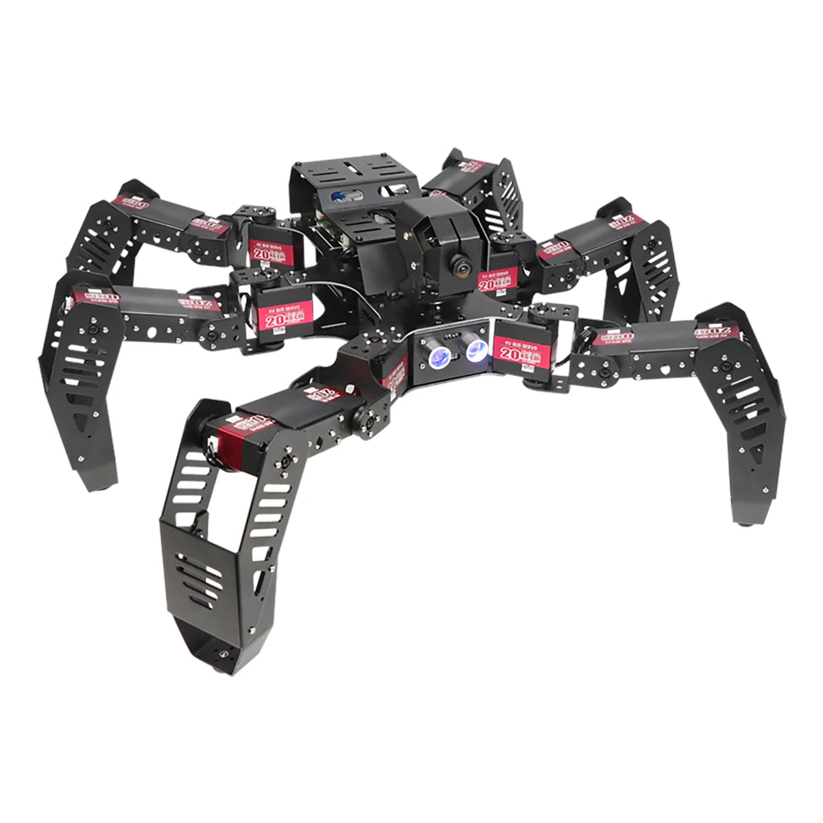 SpiderPi features a high-res camera with 2-Degrees-of-Freedom rotation, which can conduct a real-time survey of the surrounding environment and return the screen data to the mobile phone or computer. In addition, the SpiderPi, with a glowing ultrasonic sensor and voltage display module, can turn quickly and dynamically.