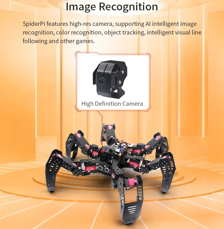 Equipped with a 2-DOF high-definition camera, SpiderPi can perform Facial Recognition, Color Recognition, Tag Recognition, Color Tracking, Line Follow, etc. With the help of SpiderPi, you will learn robot machine vision, OpenCV, and robot knowledge.