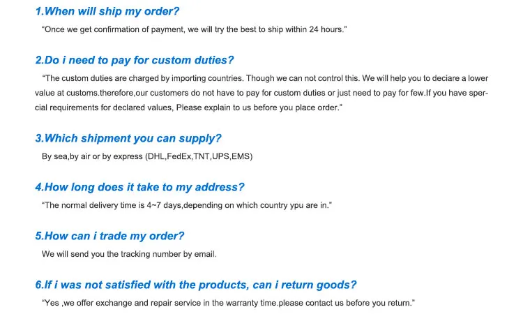 | Delivery term | FEDEX, DHL, TNT,UPS,sea or air | Delivery time | 3-10 working days normally by air |