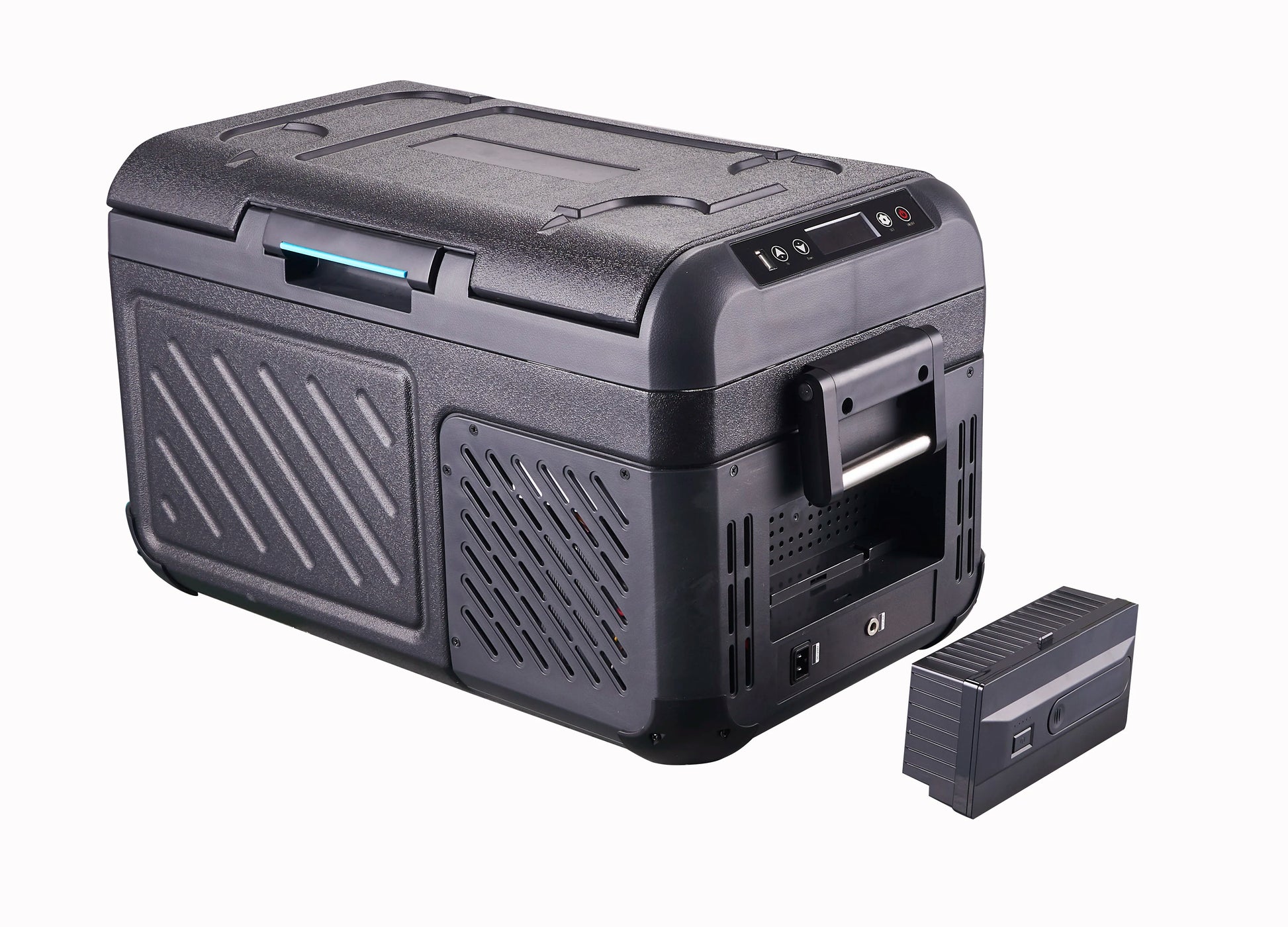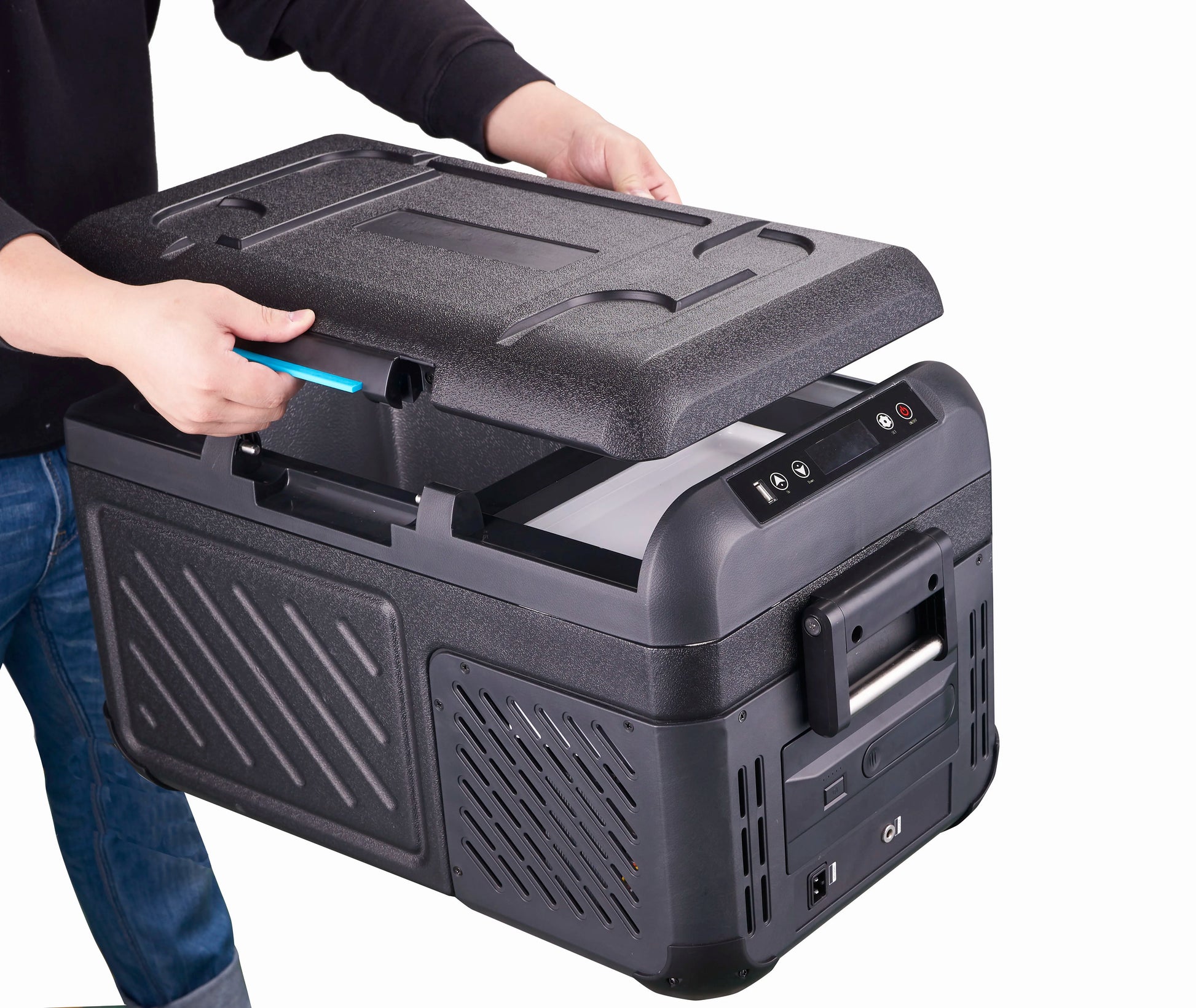 1. 18L capacity 2. Function: Built-in battery and solar interface(optional), ice box, USB interface, LED lights, reverse/removable door and drain plug 3. Temperature setting: +20°C to -20°C 4. DC 12V/DC 24V, available for cars and trucks/buses 5. Withstand a short-term inclination of 30°, can fit for various outdoor situation. 6. Featured with 3-level low voltage protection function. 7. Temperature displayed and set on control panel with selected unit Celsius or Fahrenheit. 8. ECO Mode and High Speed Mode option on the panel.