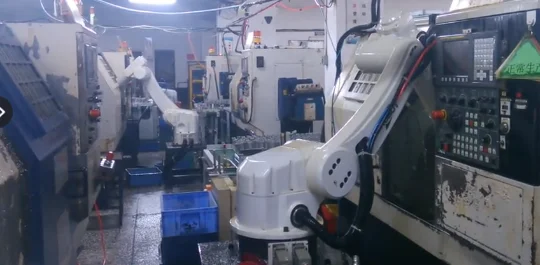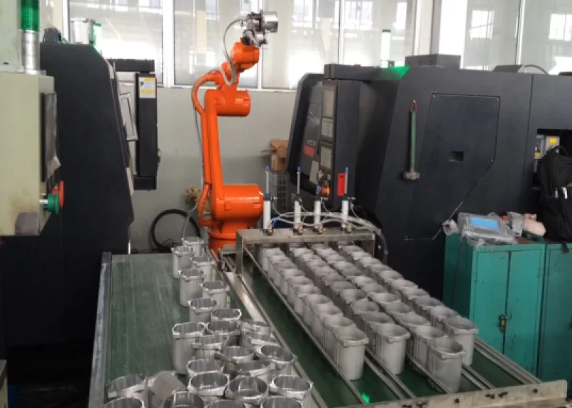 CNC lathe loading &unloading The figure shows a NC lathe automatic loading &unloading solution provided for a customer. Combined with the production line, one robot can manage two face-to-face NC machines, thereby significantly reducing labor cost and time cost and enhancing productivity of the customer.