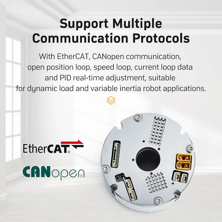 | Support Multiple Communication Protocols robot joint motor brushless With EtherCAT, CANopen communication, open position loop, speed loop, current loop data and PID real-time adjustment, suitable for dynamic load and variable inertia robot applications. | ![]() |