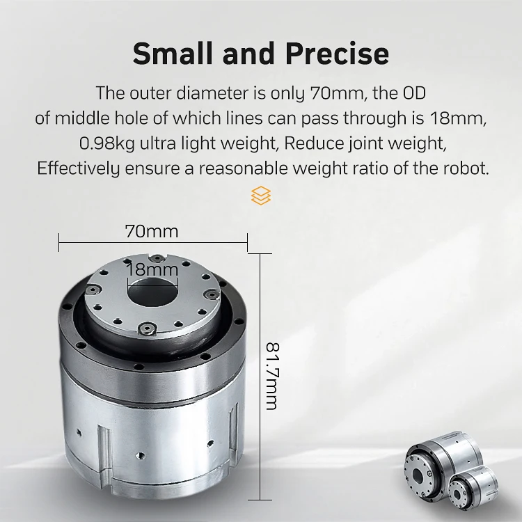 | Small and Precise robot joint motor brushless The eRob70 model robot joint motor outer diameter is only 70mm, the OD of middle hole of which lines can pass through is 18mm. 0.98kg ultra thin light weight, reduce joing weight. Effective ensure a reasonable weight ratio of the robot. | ![]() |