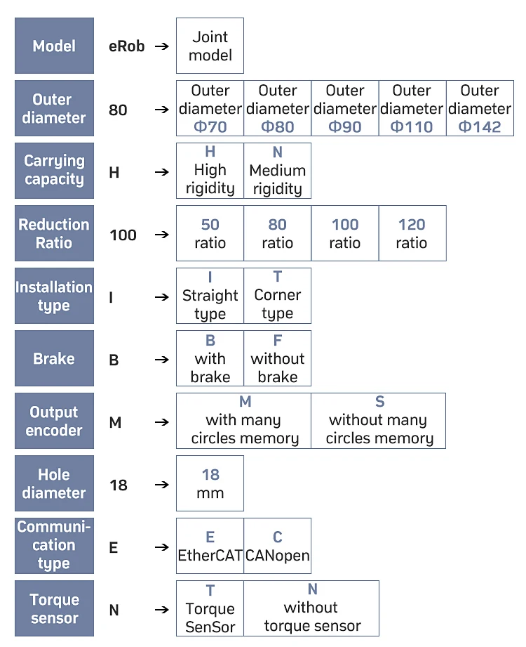 This eRob series robot joint modules include eRob70, eRob80, eRob90, eRob110, eRob142, etc., with exquisite design and compact structure. The compact size includes servo drivers, motor side absolute value encoder, output side absolute value encoder, and frameless torque motors, brakes, precision harmonic reducers and other main components, which save customers hundreds of mechanical and electronic components selection, design, procurement, assembly labor and time costs.
