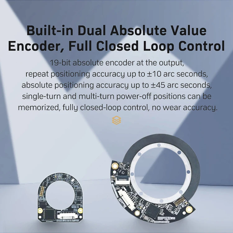 ![]() | Bulit-in Dual Absolute Value Encoder, Full Closed Loop Control robot joint motor brushless 19-bit absolute encoder at the output, repeat positioning accuracy up to ±10 arcseconds, absolute positioning accuracy up to ±45 arcseconds, single-turn and multi-turn power-off positions can be memorized, fully closed-loop control, no wear accuracy. |