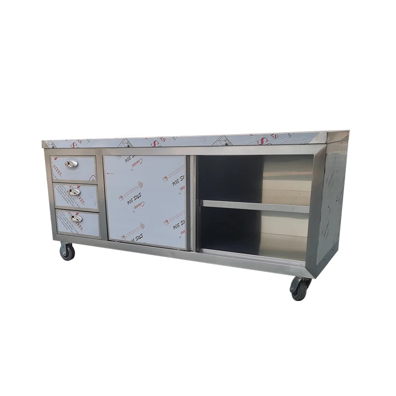 Now you are look at our heavy duty kitchen Stainless Steel Work Bench Cabinet. They might not be familiar with normal people because they always hid inside the restaurant or hotel kitchen. Actually, they are the unsung hero of every commercial kithen. The kitchen can not operate without the helo of this Kitchen Stainless Steel Work Bench Cabinet. It could be use as a table to storage all the cooking ingredient, kitchen tool & accessories. Thanks to the heavy duty design and stronge feet, chef can also work on it. No matter you need to put an cooker on it or put a chopping board, they all are competent.