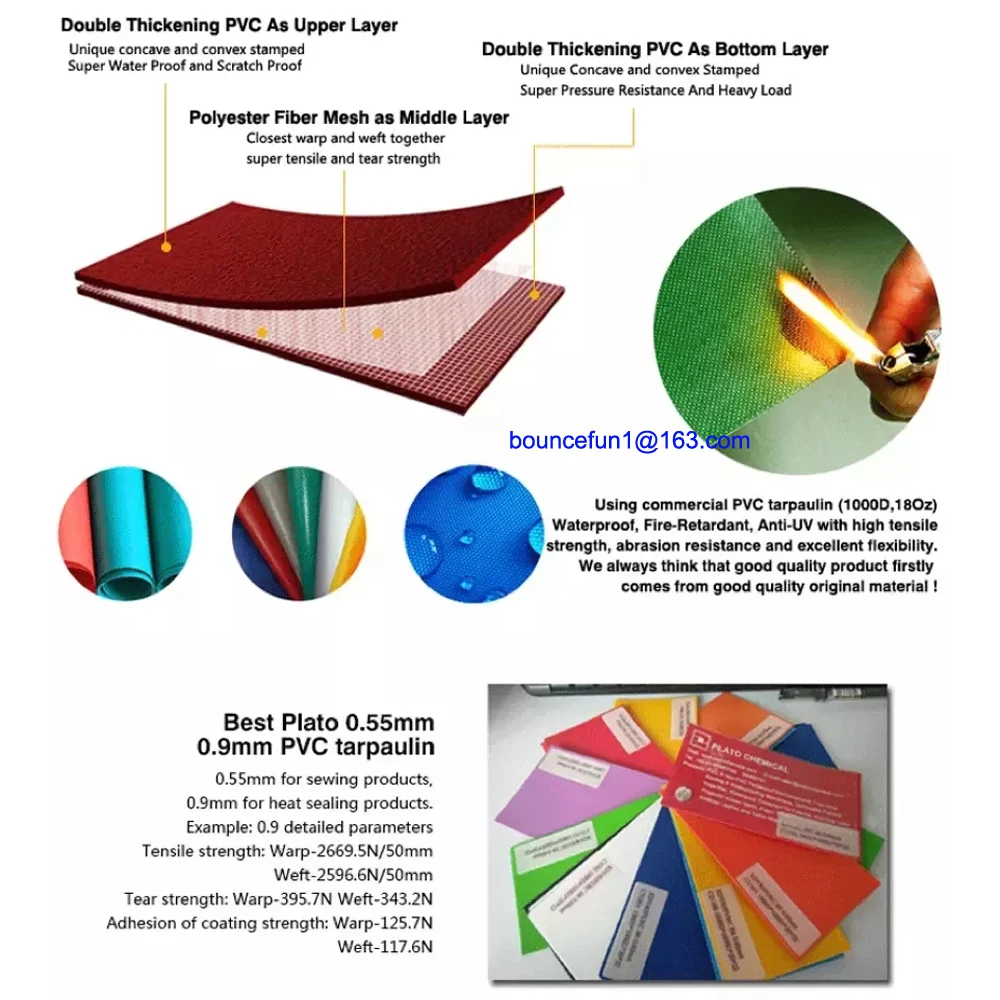 Our material is commercial grade PVC tarpaulin. It is water-proof, fire-retardant, UV-treated and passed SGS certificate. It has mesh fabric with pvc coating to provide the material higher strength and flexibility.