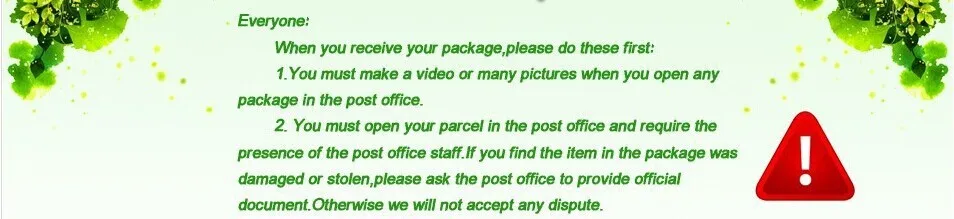 1: For Damage: We Will Pack our product in good conditon before shipping. but because since it's a very long distance from China to Your country, so in case anyting, When You Sign the Package, Please open the box to check everything first. If the product any damage, please make video before the post office people and offer us offical postal office docuemnt to proof the damage. if not, we will not accept any complaint.