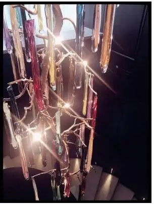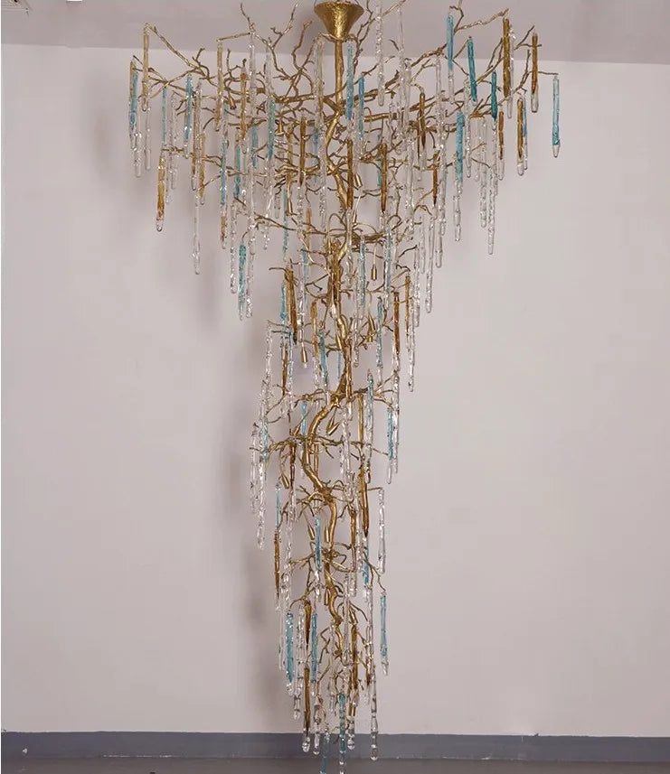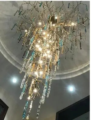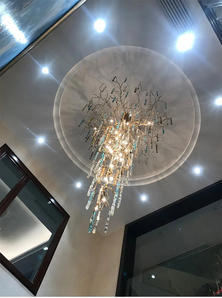 Italian villa living room glass copper crystal chandelier French luxury duplex staircase long chandelier
