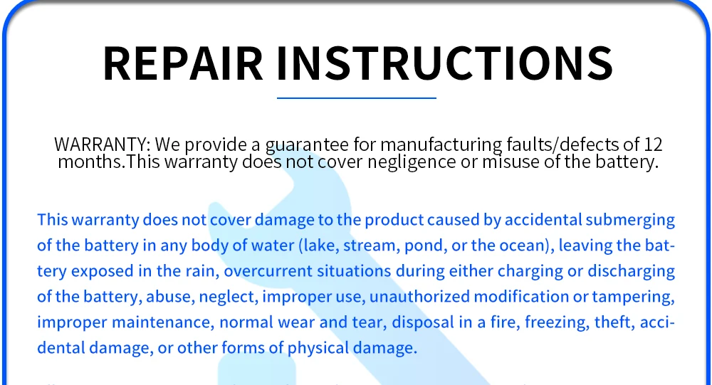 2: For damage caused , such as battery bulge/ welded, battery pack without protection BMS caused by charging.