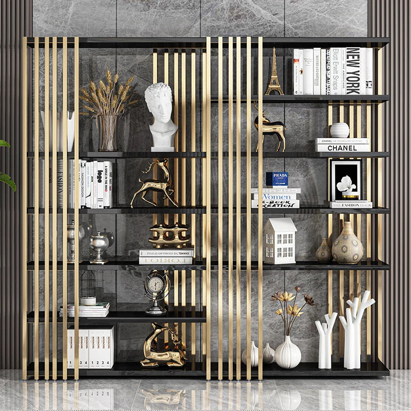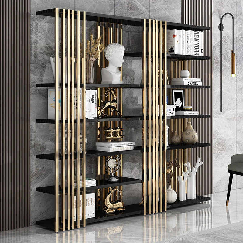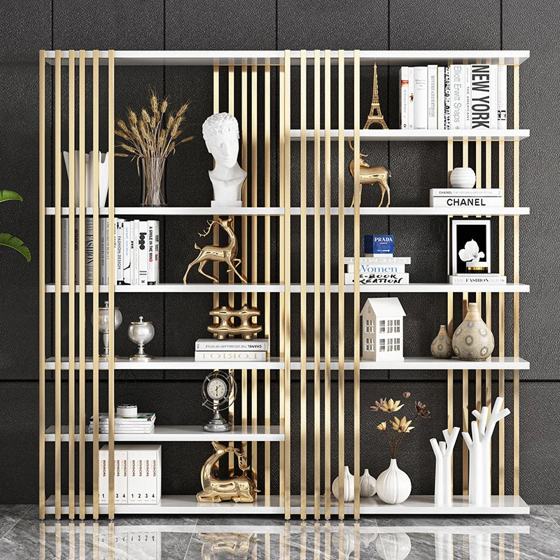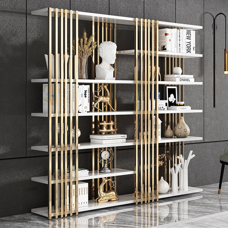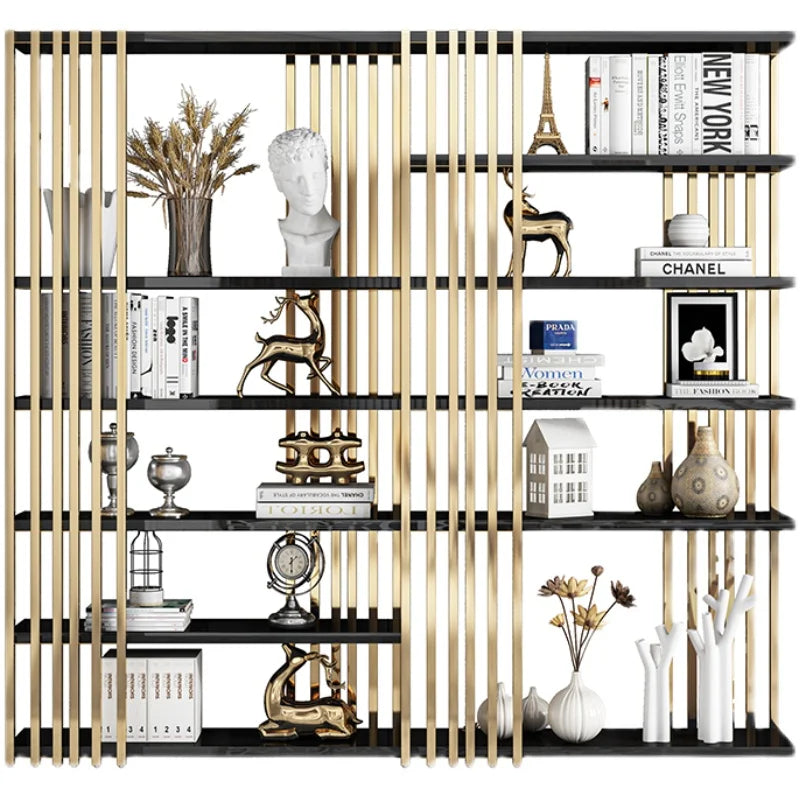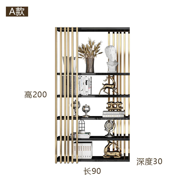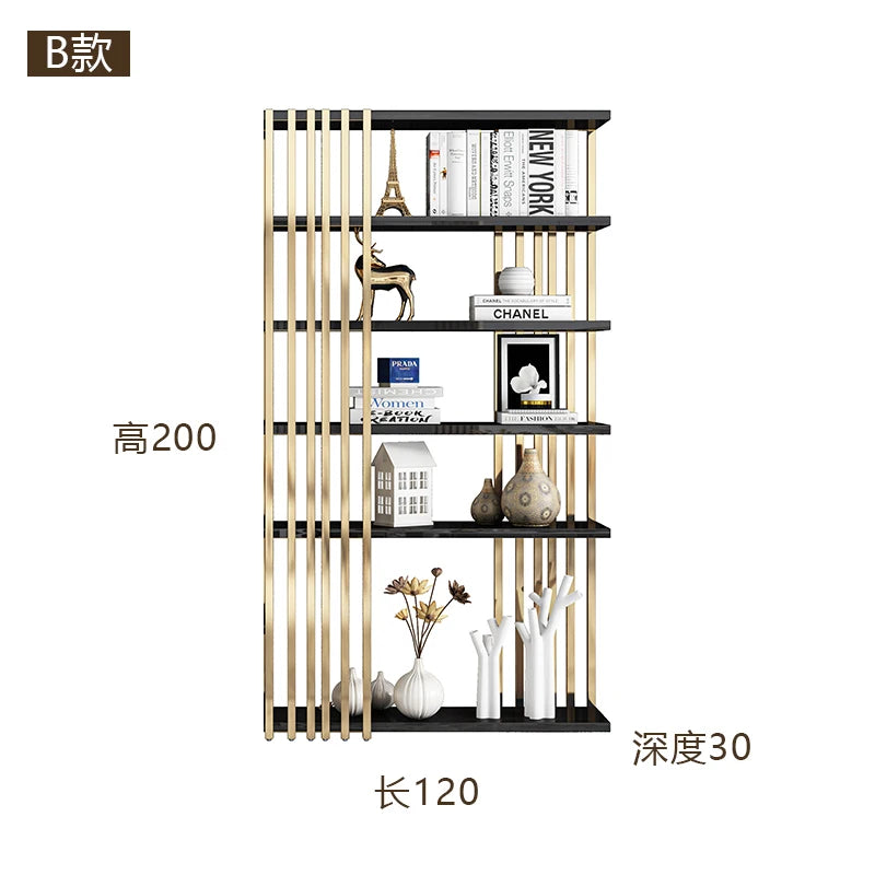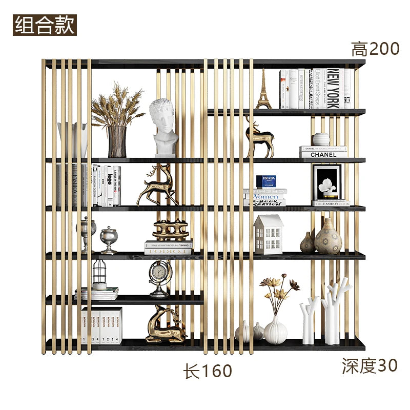 Light luxury bookshelf, stainless steel bookshelf, decorative display rack, floor mounted Bogu rack, living room partition, meta