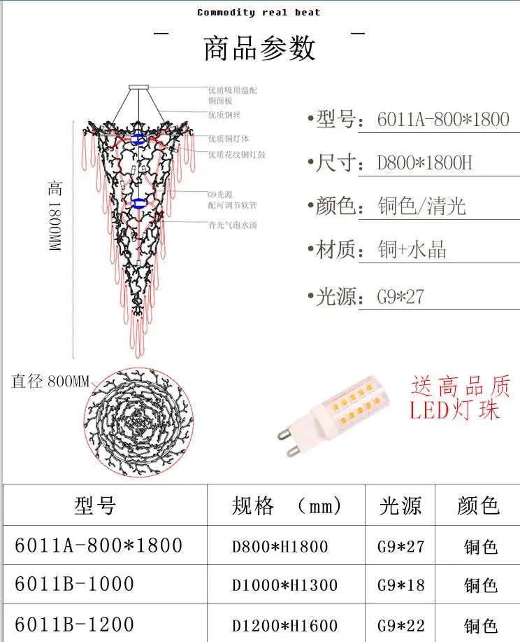 100% brand new and good qualit Item No. 5896 Item Style: Modern Material: copper ,GLASS Size: D60 x H120cm D80 x H120cm D80 x H180cm D100 x H130cm D120 x H160cm color:COPPER Clear crystal//COPPER cryster Light Source: LED Bulbs Color Tempeature: Warm light(3000K), Cool light(6000K) Voltage: AC110-240V Delivery: 6-8 days Apply: Living Room, Ding Room, Bedroom: