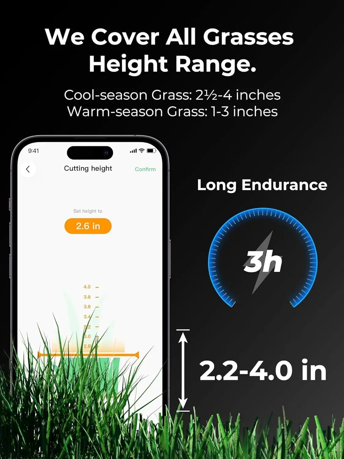 - No Corner Missed with 3D Vision& RTK Fusion-Mapping System: With enhanced RTK signal coverage and 3D vision positioning technology, places with weak signals or hefty trees coverage is no more a problem. LUBA 2 AWD 3000 All-Wheel Drive automatic robot lawn mower can navigate narrow passages, objects and slopes, handling slopes of up to 80%/ 38-degrees, cuts at a max height of 2.8 inches, and covers up to 3,767 square feet per hour, perfect for lawns that up to 0.75 acre.