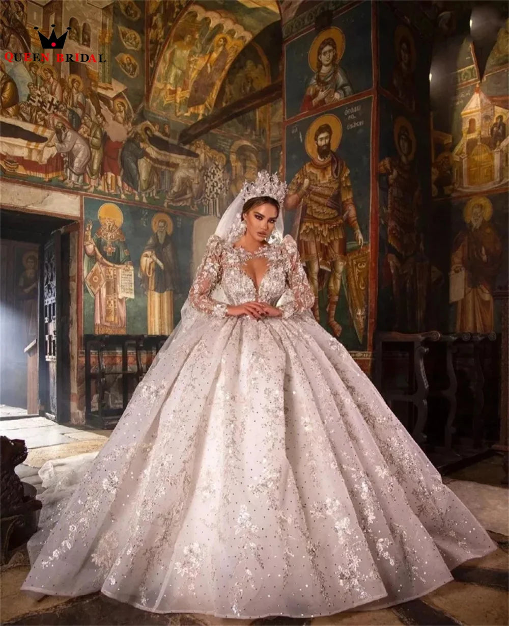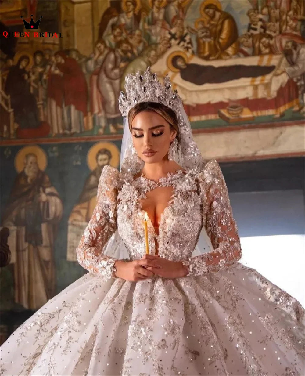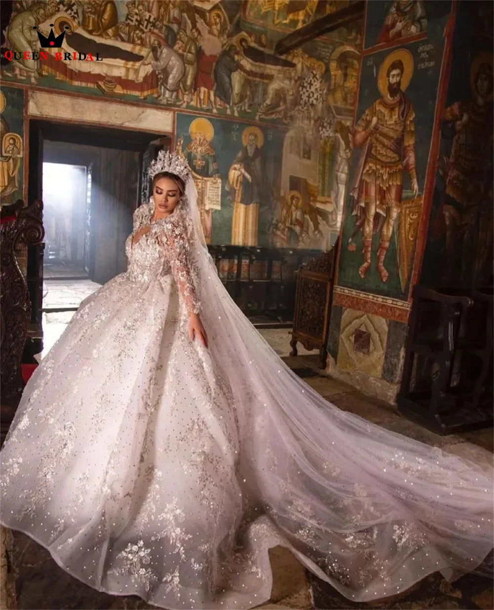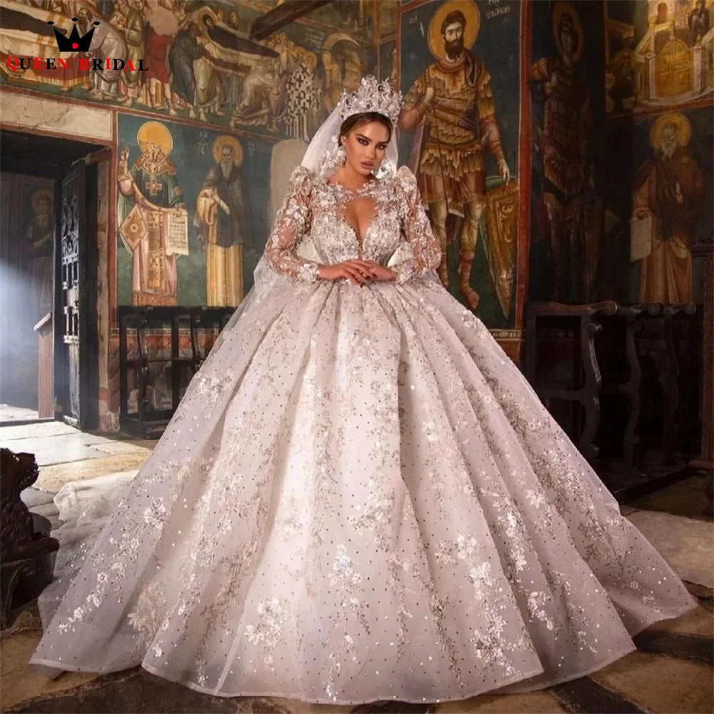 Luxurious Wedding Dresses Ball Gown Puffy Long Sleeve Tulle Lace Crystal Beaded Flowers Formal Bridal Gown Custom Size DX50