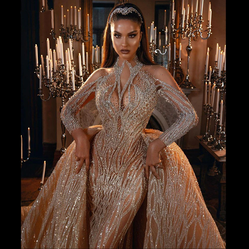 Women Luxury Beaded Bridal Mermaid Wedding Dress Floral Ruffles Sparkly Illusion