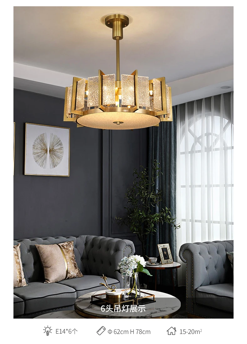 100% brand new and good qualit Item No. 5896 Item Style: Modern Material: Copper+glass Size 3heads D37 X H60CM 6heads D62 X H78CM 12heads D83 X H78CM Color: Copper + transparent color Light Source: LED Bulbs Color Tempeature: Warm light(3000K), Cool light(6000K) Voltage: AC110-240V Delivery: 6-8 days Apply: Living Room, Ding Room, Bedroom: