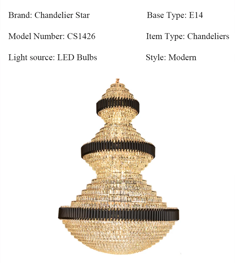 【Brand】Chandelier Star 【Item Number】CS1426 【Item Type】Chandeliers 【Material】Metal + Crystal 【Size】D100xH150cm, etc. 【Voltage】AC 90-260V 【Application】Living Room, Dining Room, Bedroom, Kitchen, Staircase, Hotel, etc.