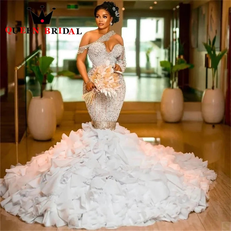 Luxury Mermaid Wedding Dresses 2023 One Shoulder Pearls Beading Ruffles Train Mermaid Bride Gowns Vestidos De Novia Custom L14M