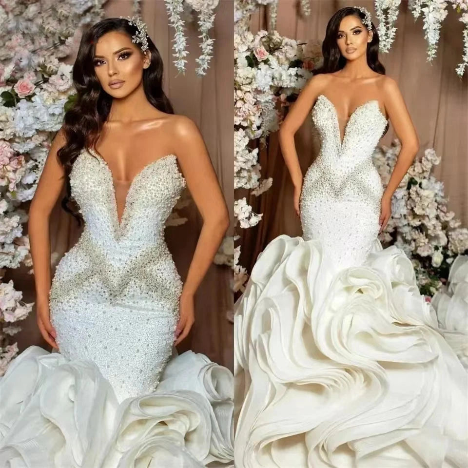 Women Luxury Beaded Bridal Mermaid Wedding Dress Floral Ruffles Sparkly Illusion
