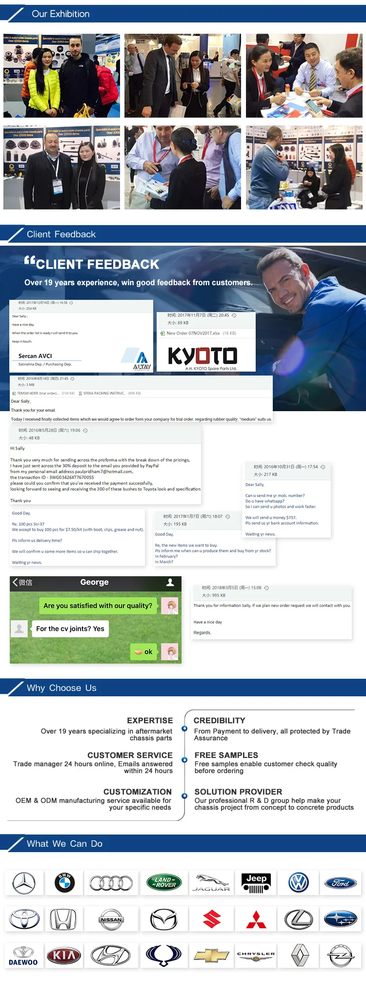 1.Korea & Japan car chassis parts: Strut mount, Bushing, Boot, Engine mount, Center bearing, Stabilizer link, Control arm, Ball joints, CV joint, Bearing, Wheel hub, Cylinder kit, Oil seal, etc.