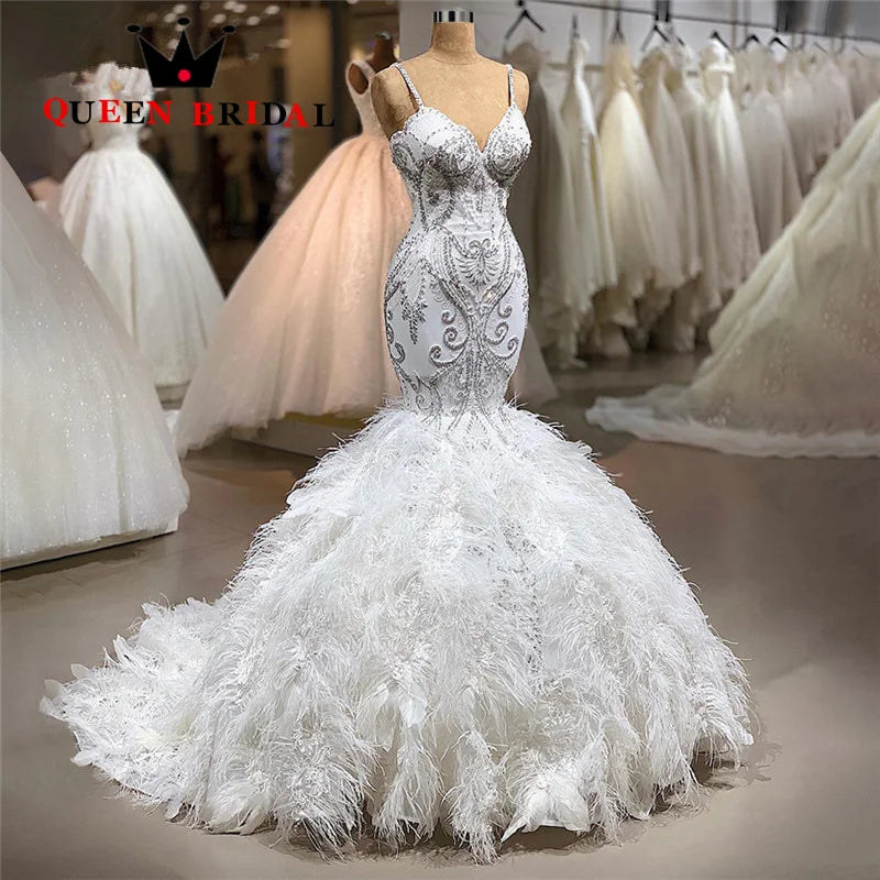 Women Luxury Beaded Bridal Mermaid Wedding Dress Floral Ruffles Sparkly Illusion