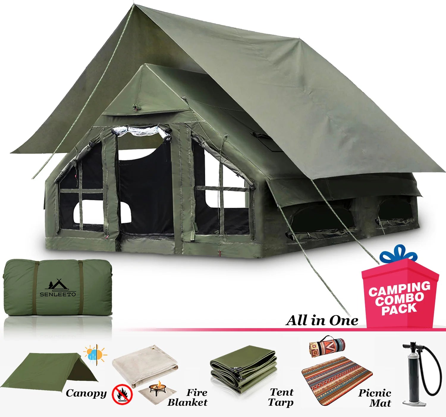 ANTNX 129 SqFt² Army Green Inflatable Camping Tent with Canopy,4 Season Air Tent with Tent Tarp & Moisture Proof Pad & Fire Blanket ANTNX.COM