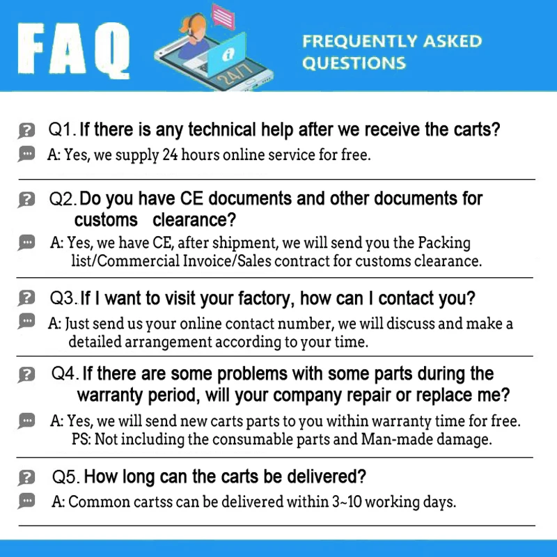 A: Yes, we will send new carts parts to you within warranty time for free. Not including the consumable parts and Man-made damage.