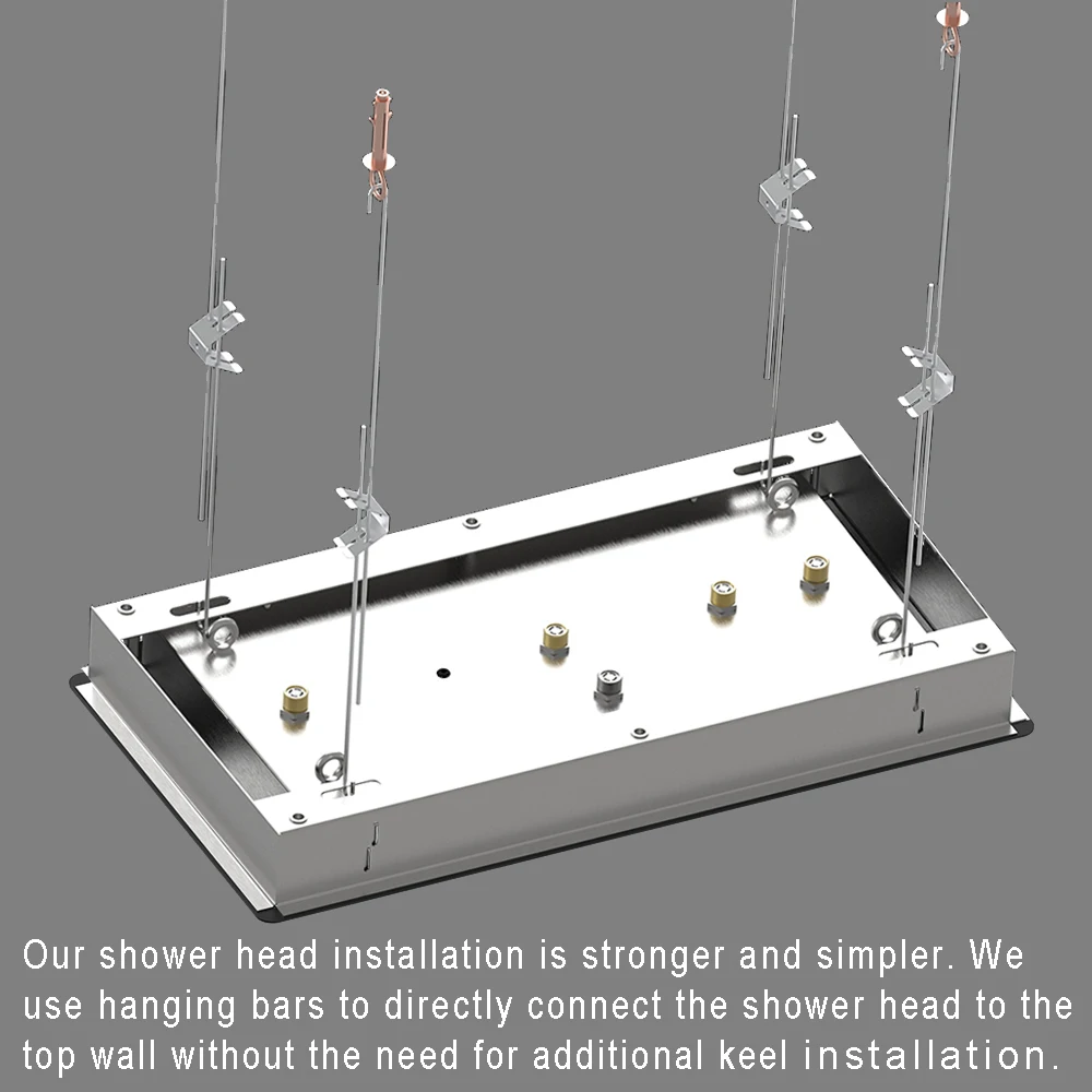 3.Use safety-Weight of the shower head about 16kg,we use hanging bars to connect the shower head to the top wall,the installation method is very sturdy and firm. The hanging bars can slide up and down through the connecting piece to ensure that the shower head fits perfectly with the ceiling and it is more beautiful.