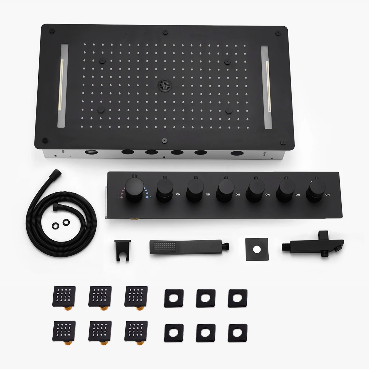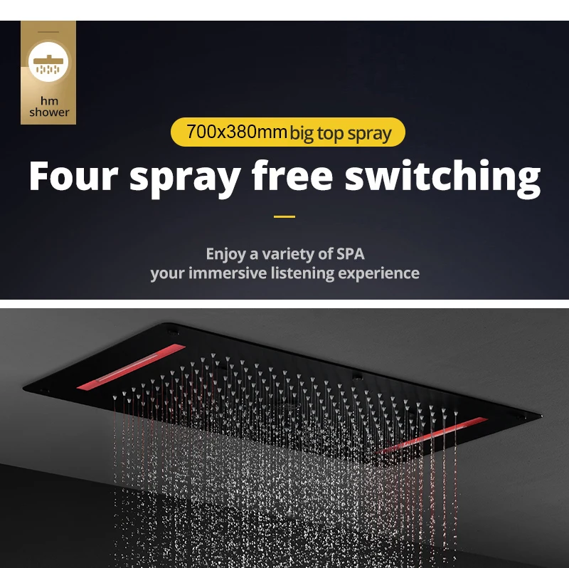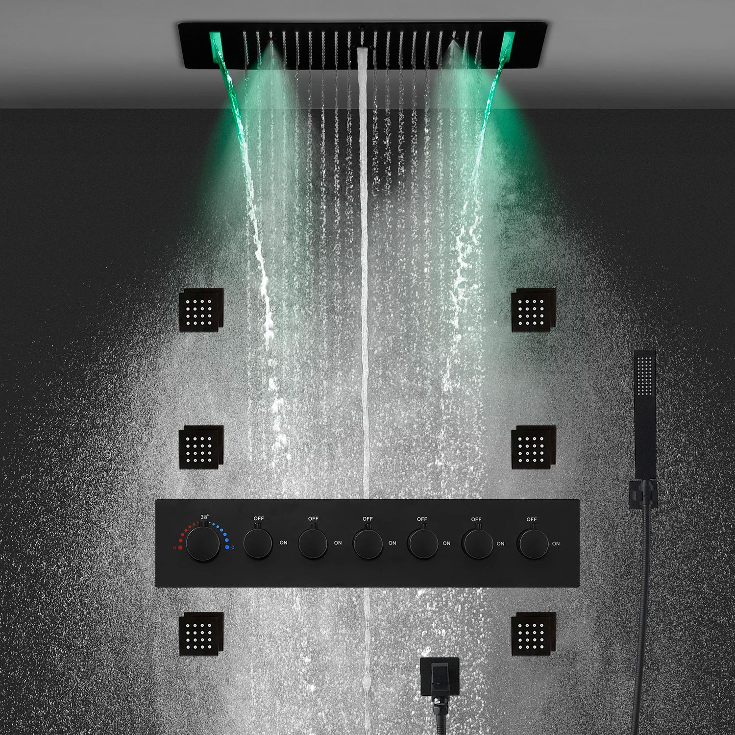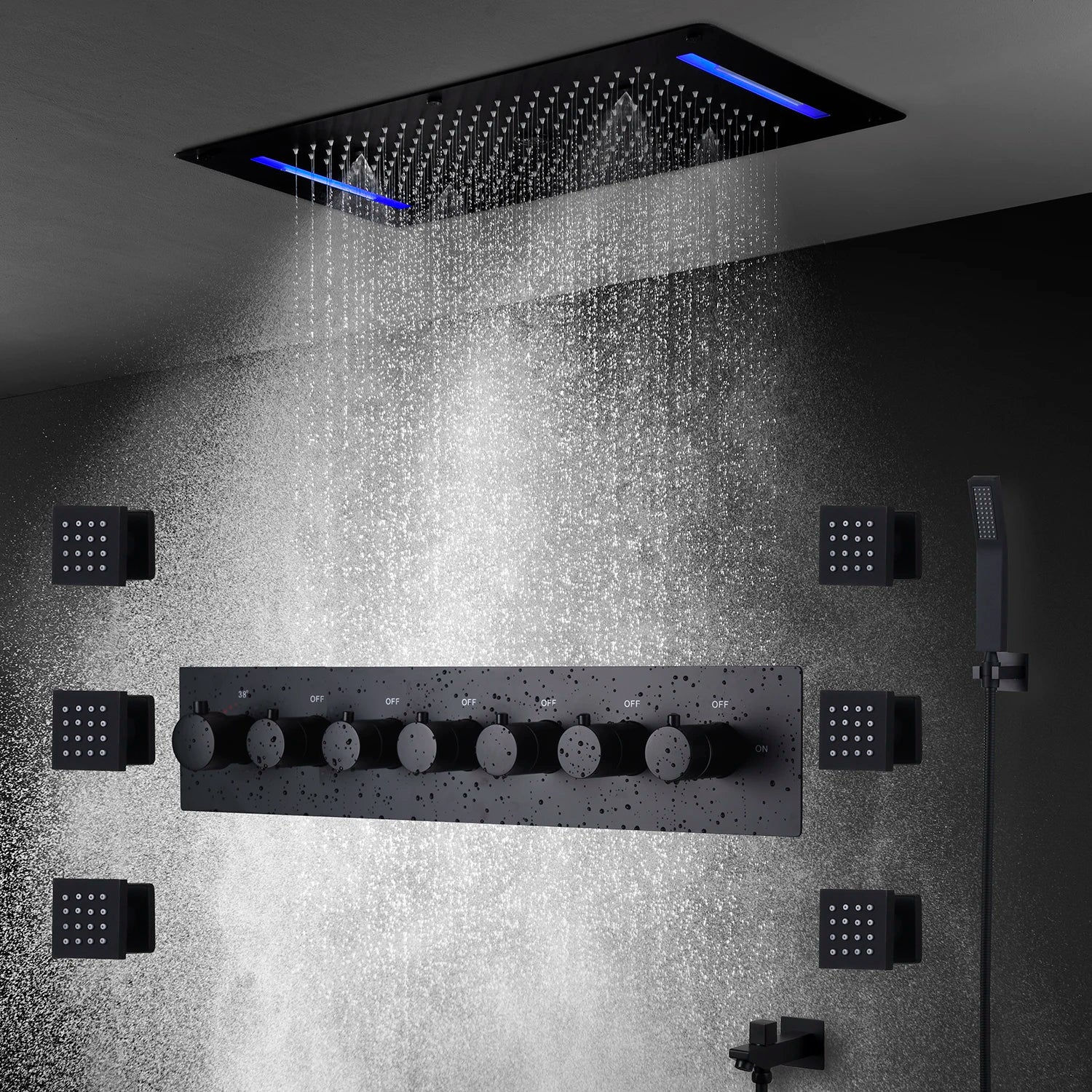 MMOOKA Matt Black Shower Faucet Panel 28x15 Inch RGB LED Shower Head Set Thermostatic Mixer Valve Kit 6 Pcs 2 Inch Side Jets MMOOKA.COM