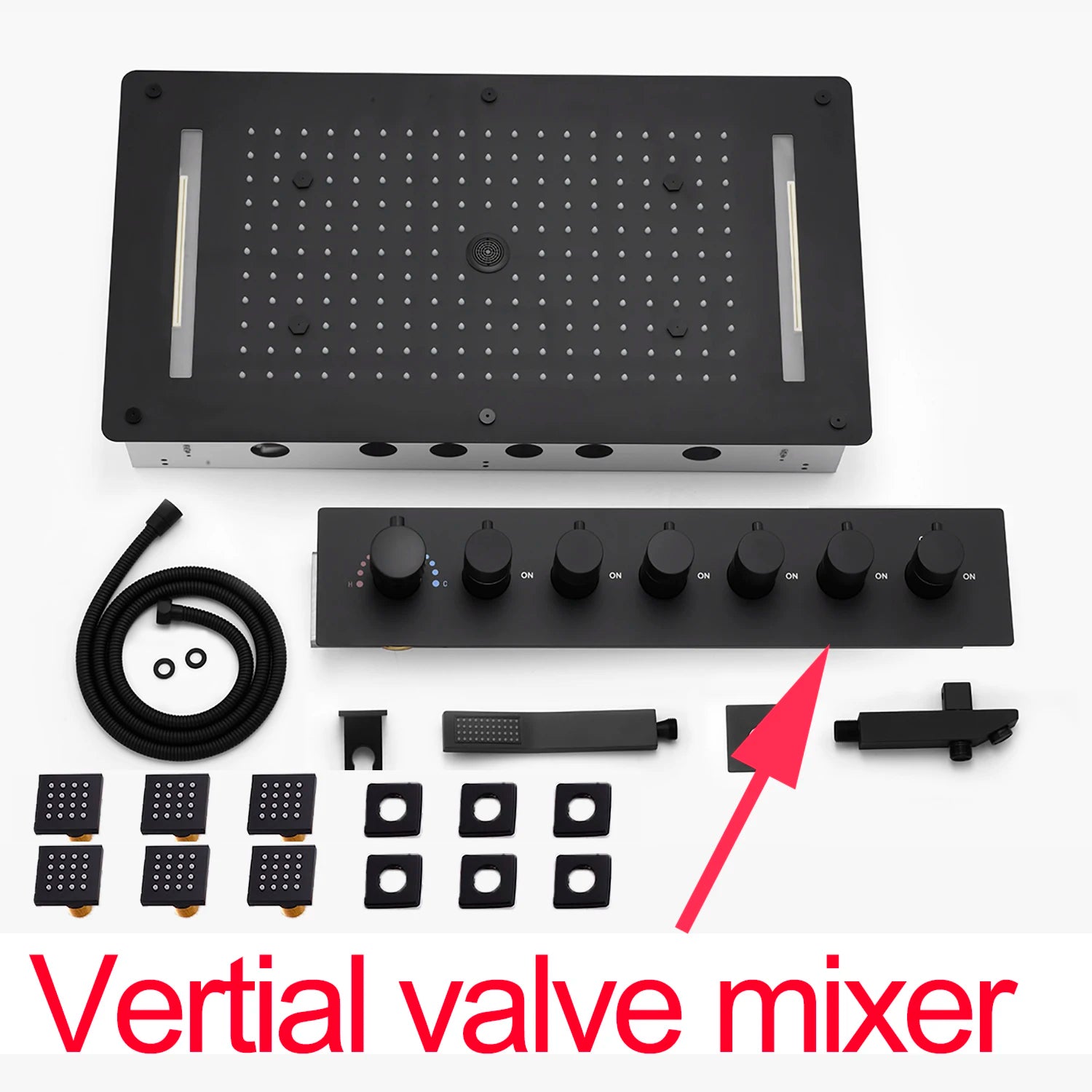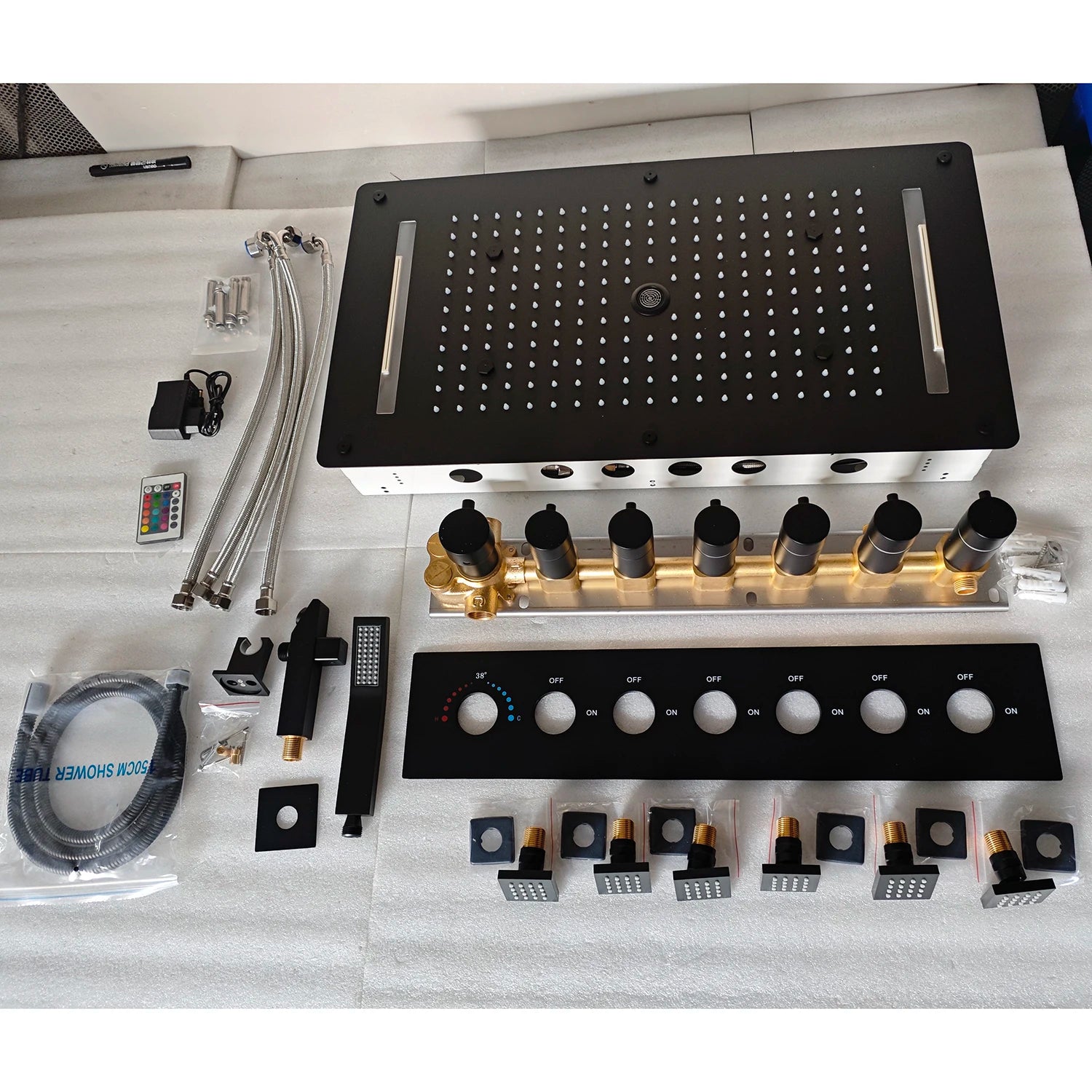 Matt Black Shower Faucet Panel 28x15 Inch RGB LED Shower Head Set Thermostatic Mixer Valve Kit 6 Pcs 2 Inch Side Jets