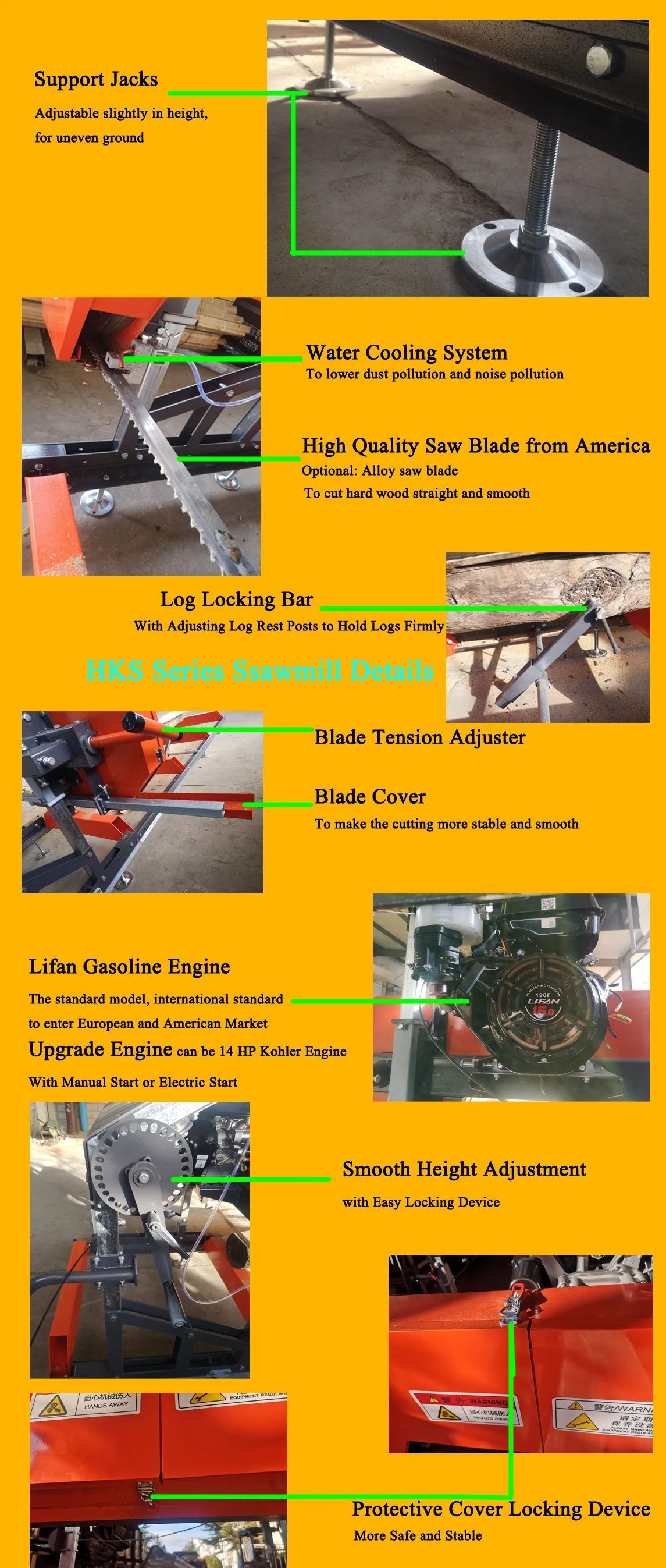 The body of HKS Series sawmill is all parts structures that easy to assemble, cost--effective, sturdy and durable, the saw wheel is high precision castings. The lightweight head and adjustable bed of Huike sawmill provide a variety of woodworking options in different environments, smooth finishing, easy to move around, suitable for the farm owners and DIY woodworking .