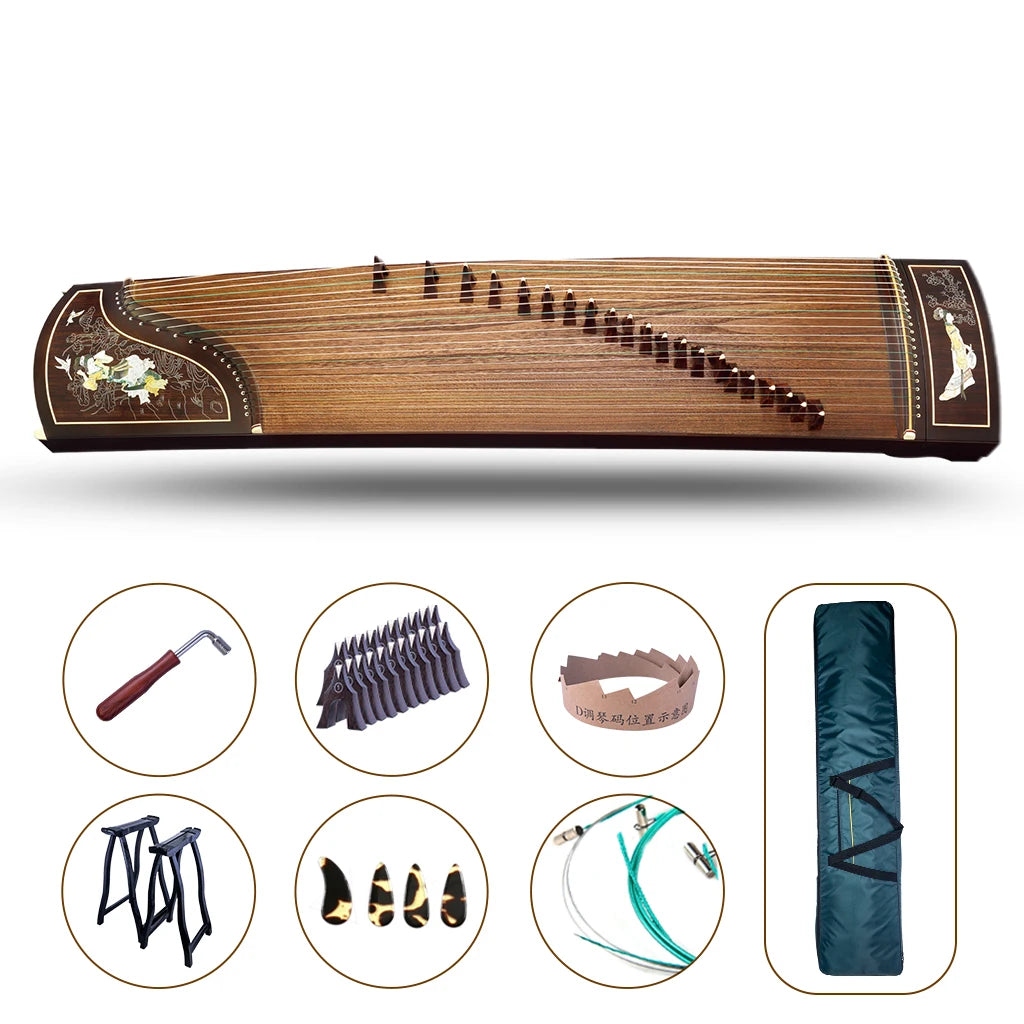 1 black sandalwood guzheng,1 sets of professional guzheng nails, 1 set of #1-5 spare strings, a set of sandalwood bridges, a pair of A style guzheng stands, a set of standard guzheng strings (fixed), a tuning hammer, a guzheng big bag.