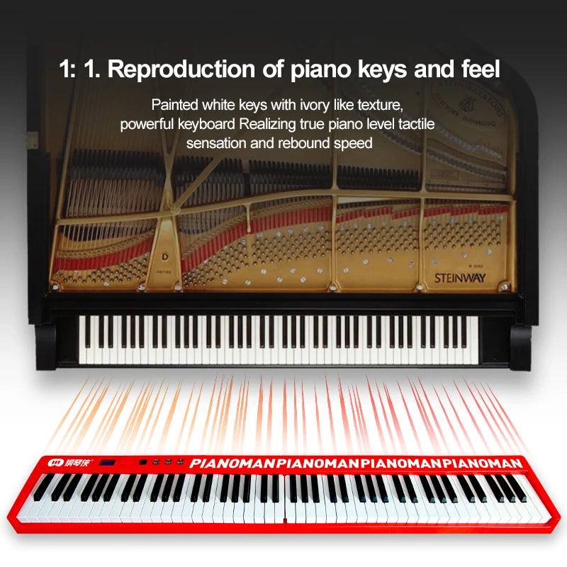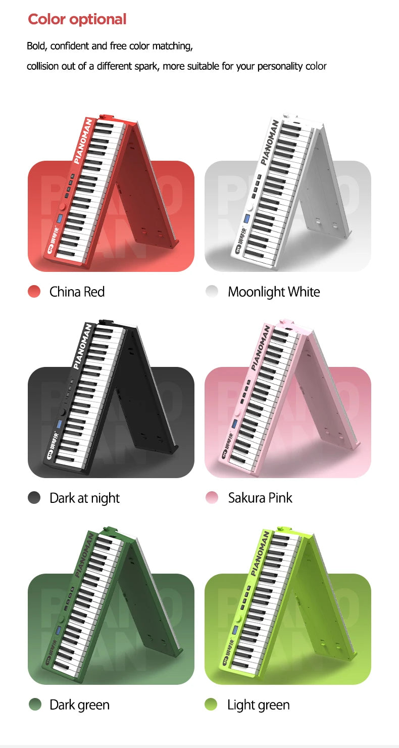 Gravity keyboard, comfortable to play, suitable for home, outdoor, and camping. And the foldable electronic keyboard is hinged through the rear end connection. Shortens the length of the keys while maintaining the playing feel. Performances can be performed inside the car, on buses, or on airplanes, some of which do not even need to be checked in.