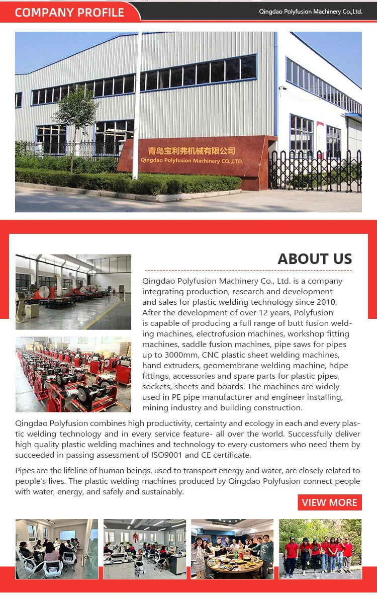 Qingdao Polyfusion Machinery Co., Ltd. is a company integrating production, research and development and sales for plastic welding technology since 2010. After the development of over 12 years, Polyfusion is capable of producing a full range of butt fusion welding machines, electrofusion machines, workshop fitting machines, saddle fusion machines, pipe saws for pipes up to 3000mm, CNC plastic sheet welding machines, hand extruders, geomembrane welding machine, hdpe fittings, accessories and spare parts for plastic pipes, sockets, sheets and boards. The machines are widely used in PE pipe manufacturer and engineer installing, mining industry and building construction.