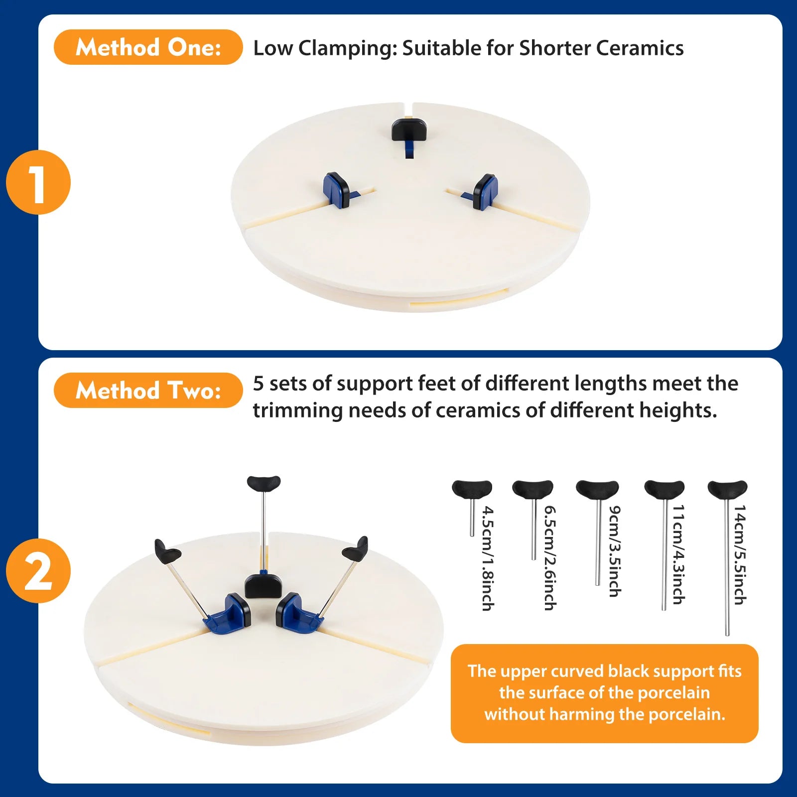 5 Sets of Support Feet: 5 sets of support feet of different lengths cooperating with fixing clips can meet the trimming needs of ceramic crafts of different heights. The upper curved black support fits the surface of the porcelain, clamping stably without harming the porcelain.