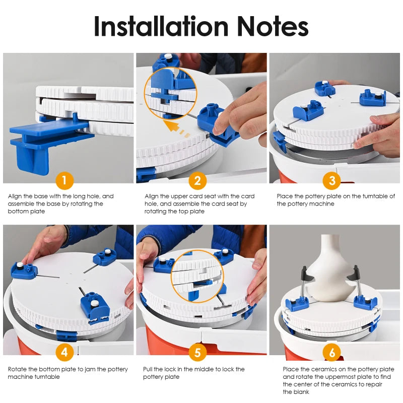 【Easy Installation】-Just place the repair clamp on the turntable of the ceramic art machine, turn the turntable under the repair clamp to fix it on the turntable, and then buckle the side buckle to jam the repair tool, that is Pottery tray clamp can be used easily.
