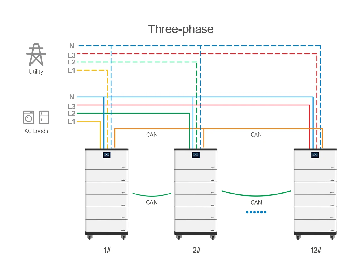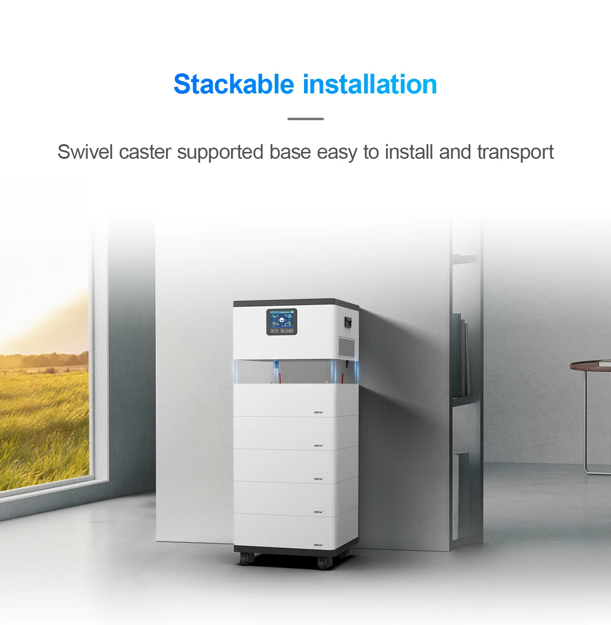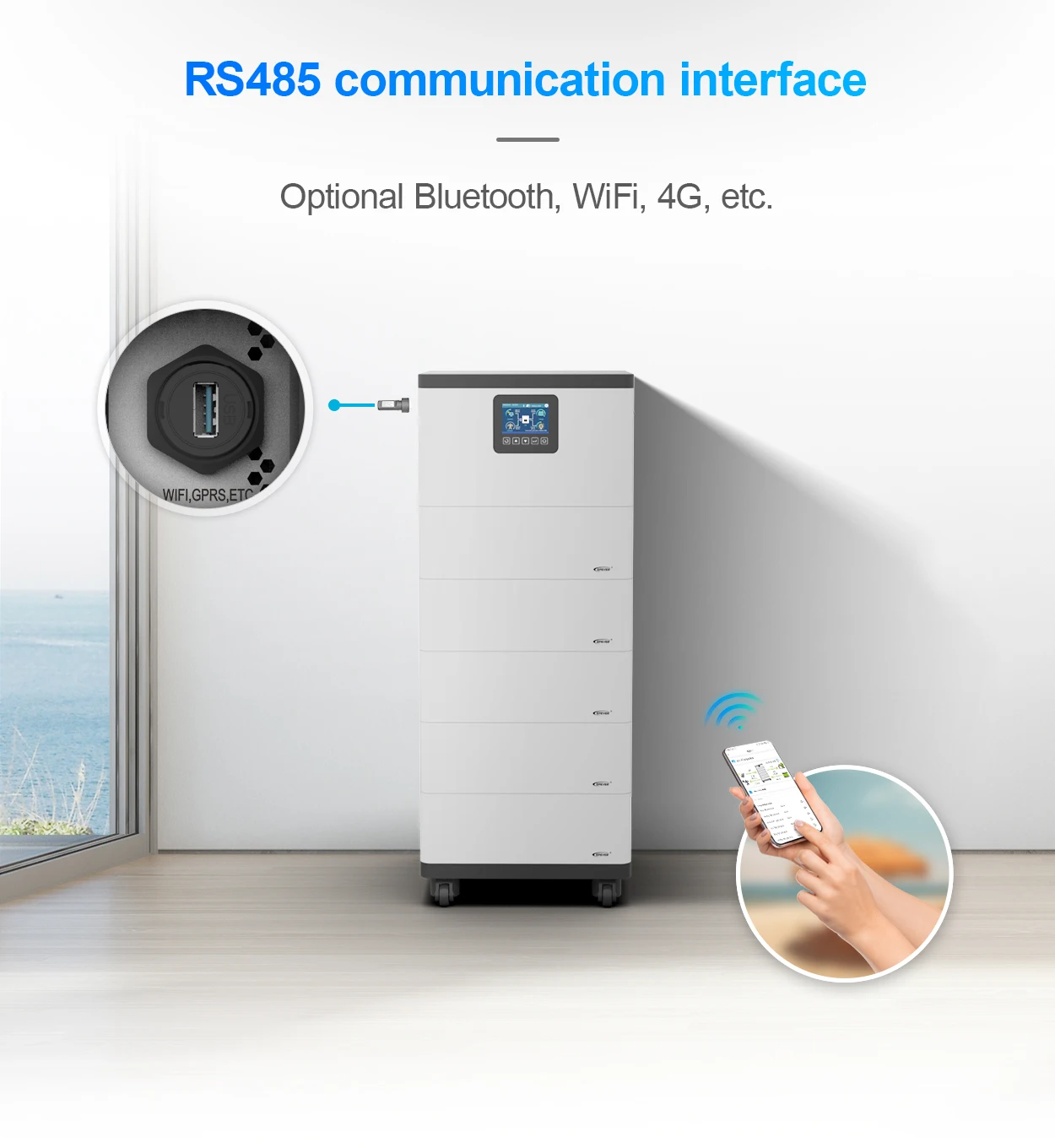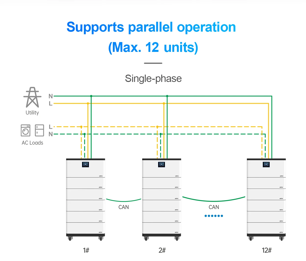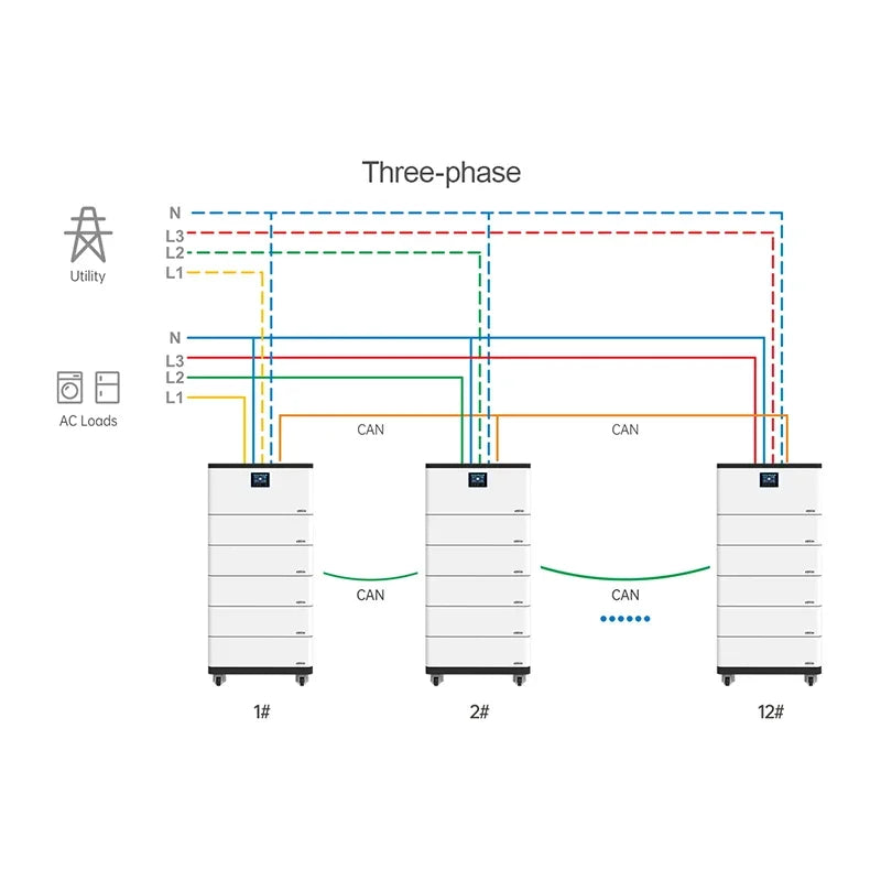 *Stackable installation with swivel wheel design for easy mobility *High-durability lithium batteries (over 6000 cycles) *Pure sine wave output *Main unit supports single-phase and three-phase parallel operation (up to 12 units) *Dual PV input support enhances PV utilization efficiency *RS485 communication interface, optional Bluetooth, WiFi, 4G,etc. *Remote monitoring via App *Historical data recording function, storage capacity of 25000 records *Comprehensive electronic protection *Operating temperature range: -20℃ to 50℃