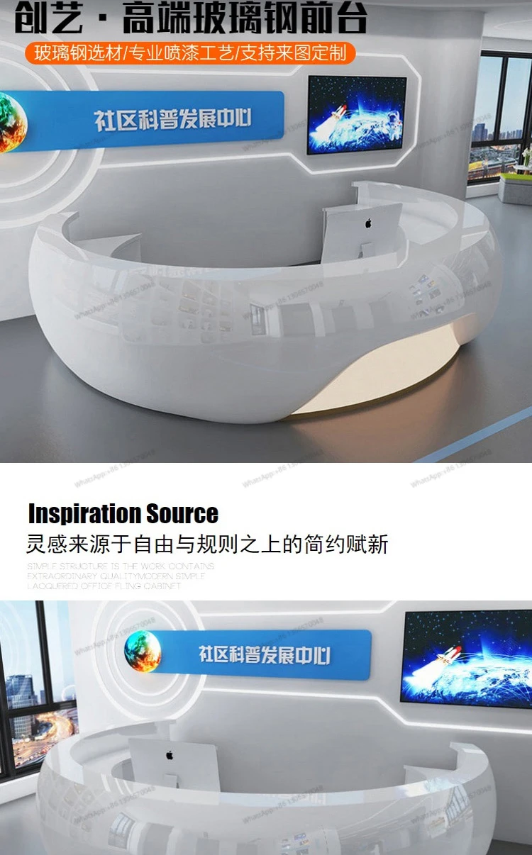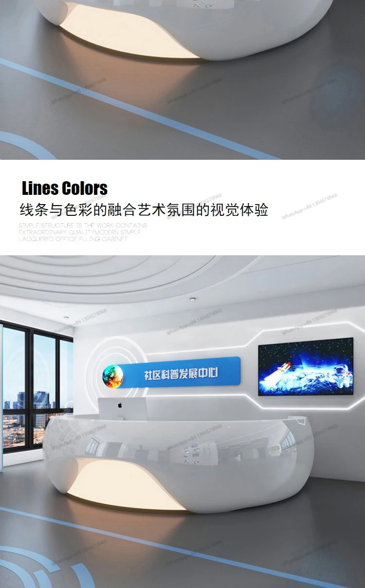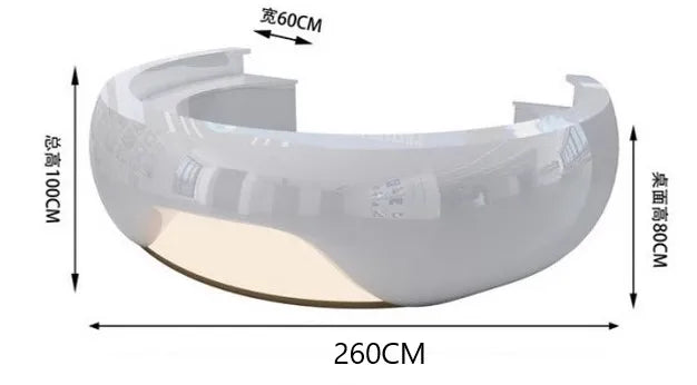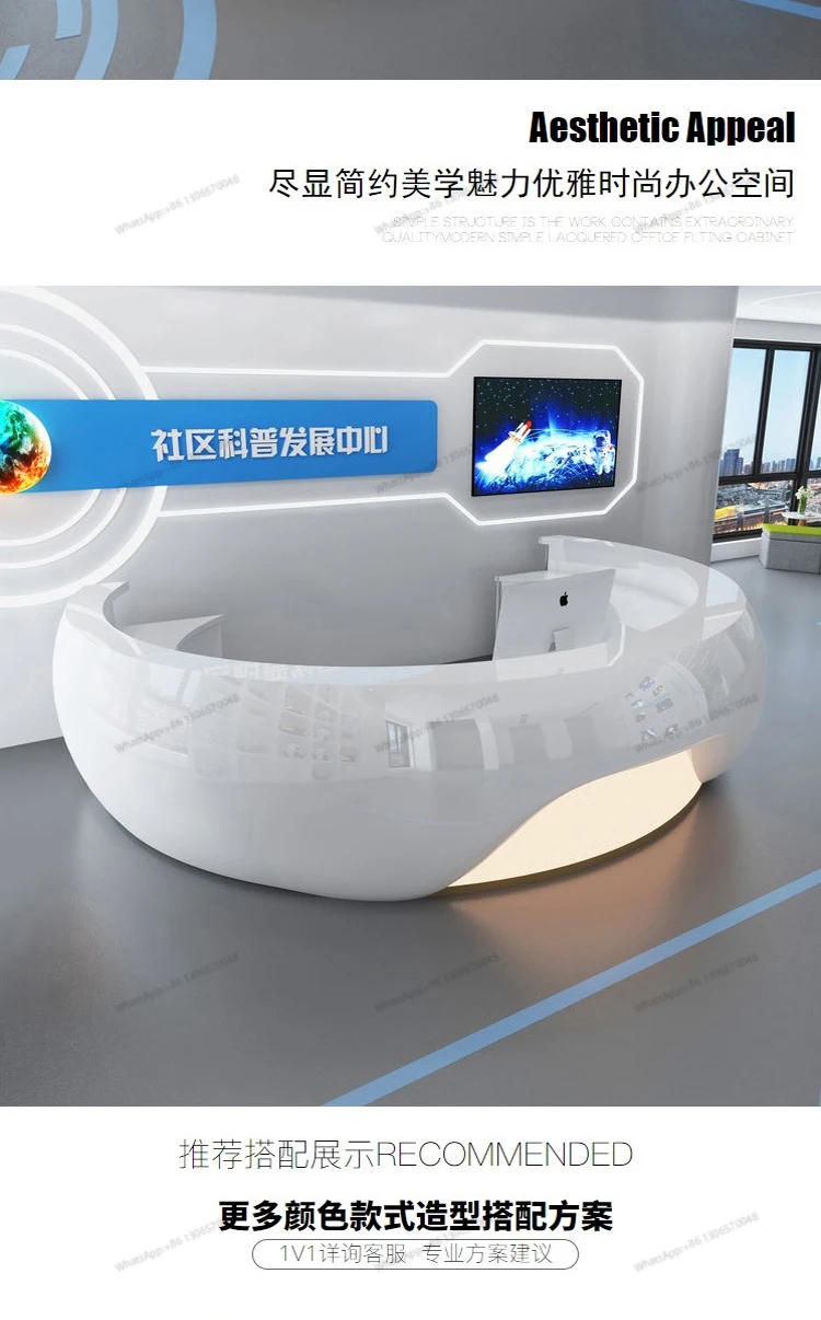 Modern minimalist circular arc shaped front desk, fiberglass painted bar counter, hotel real estate sales department, reception