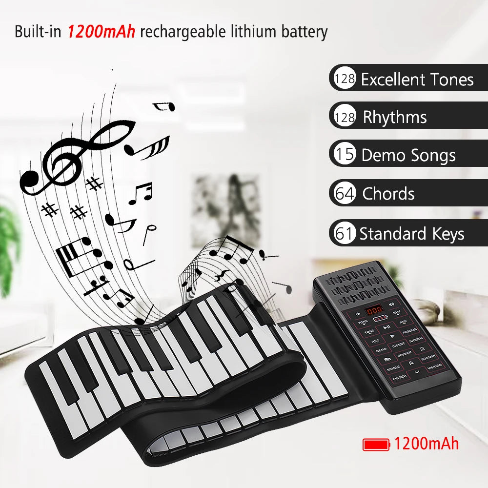 Multifunction Portable Electric 61 Keys Hand Roll Up Piano Flexible Silicone Piano Keyboard Built-in Speaker Rechargeable