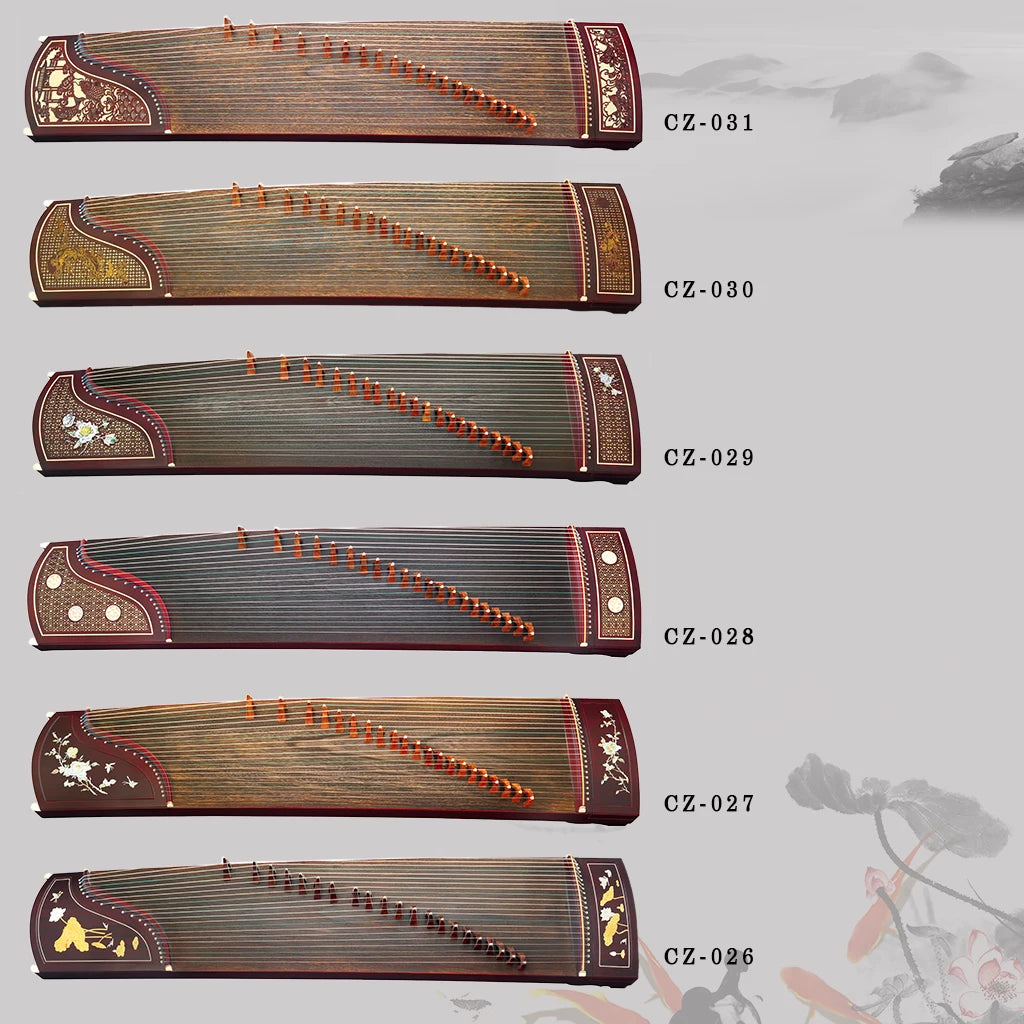 This guzheng adopts rosy sandalwood, paulownia wood, pine wood and solid wood as the main material. All the material used were of good quality and were soaked, slag removed and dried before using, which directly contribute to the smooth touch feeling and good sound of the guzheng. The carved Chinese characters were handcrafted by professional cutlers with precise workmanship, making the guzheng exquisite and elegant as well as giving the guzheng culture connotation. The strings were covered by nylon to make the sound rich, mellow and vibrant.