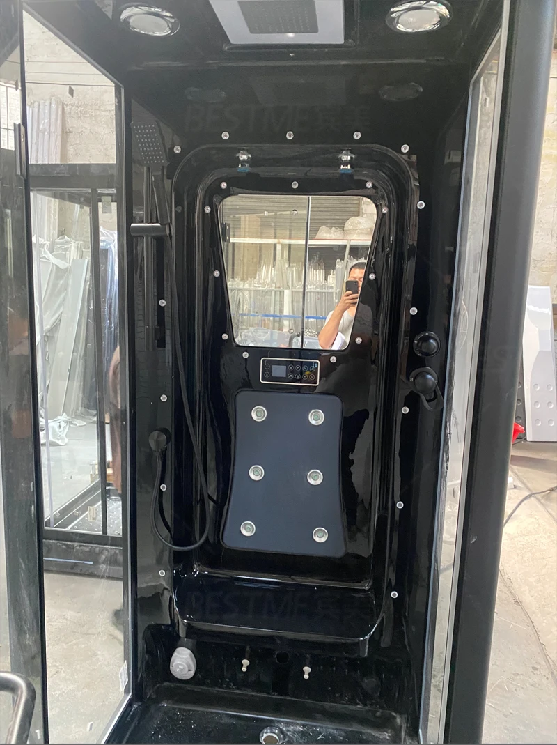 | Main devices | Remote control,Electronic control panel,Steam sauna,Needle nozzle,LED Multi-color light copper,Sprinkler,Handy shelves,FM radio,Fan,Light unit , Leakage protection , Silding door and panels in tempered glass , Non-slip base |