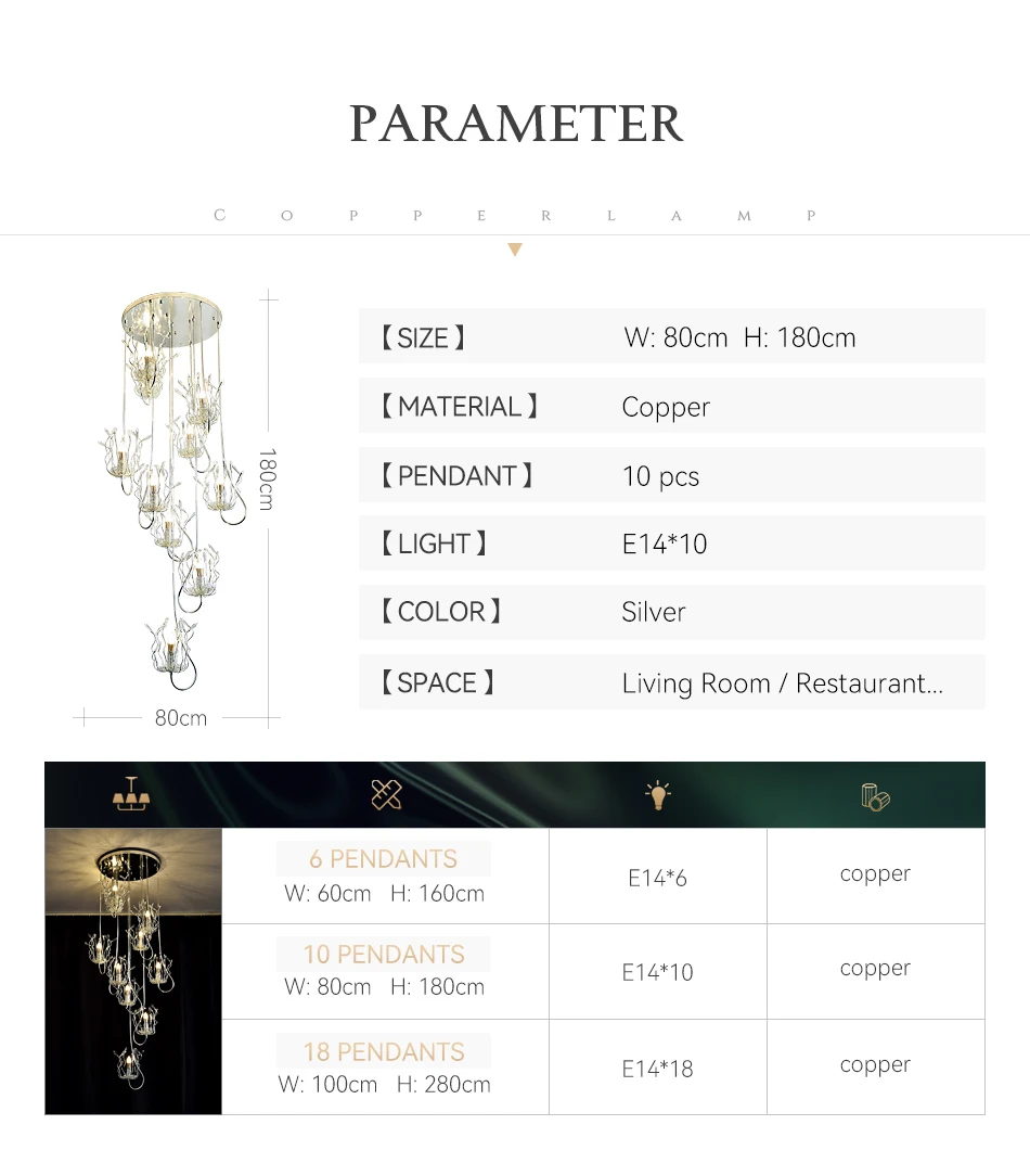 Size:Dia60*H160cm(6 lights),Dia80*H180cm(10 lights),Dia100*H280cm(18 lights)(can be customized)