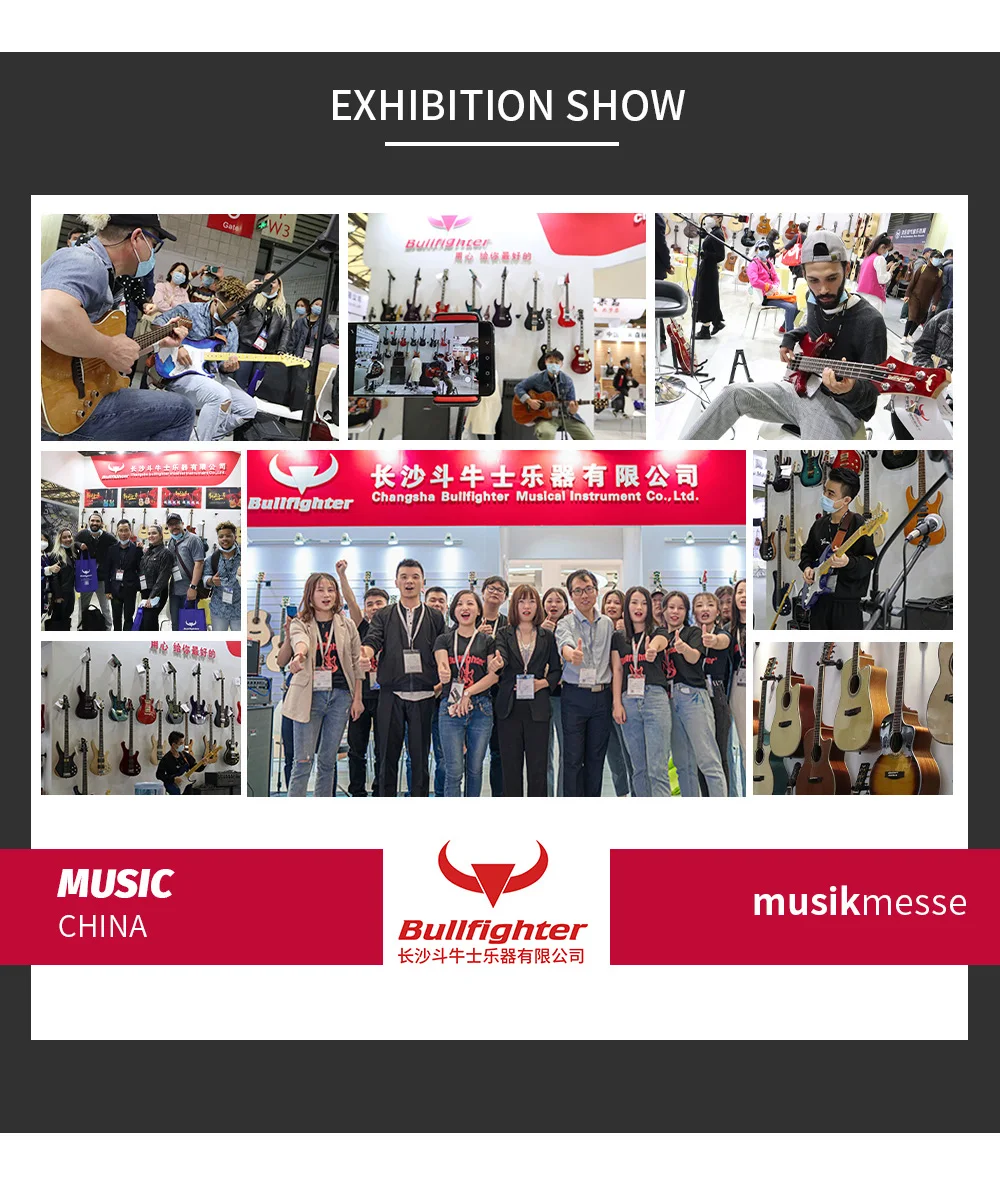 Changsha bullfighter musical instrument co., Ltd was established in 2015, is a professional manufacturer engaged in the research,development, production, sale and service of musical instruments. We have focused on top-quality guitar, drum sets, wind instruments for 5 years. We started as a small operation, but now we are a government-supporting enterprise importing and exporting musical instruments. Our main products are including Amplifiers and Acoustic Guitars, Electric Guitars, drum sets,saxophone and other instruments, etc. Over the years, we have been cooperating with many big brands and famous companies to develop products. Our Products are selling to dozens of areas and countries including Europe, South and North America, Asia,Oceania, etc. Also, our Products have received good feedbacks and become popular among customers, share a high reputation from domestic and foreign markets. We have established our own brand "Bullfighter""minsine””Lanyun”, integrating delicate craft,scientific product structure and spirit of many world-famous brands. At present, we have two production workshops covering 12,000 square meters, one of which produces 15,000 acoustic and electric guitars and another produces 1000 sets of speakers and electronic drums every month. We have an excellent R & D team, based on technological innovation, market-oriented, continuously produce new products to meet consumer demand.